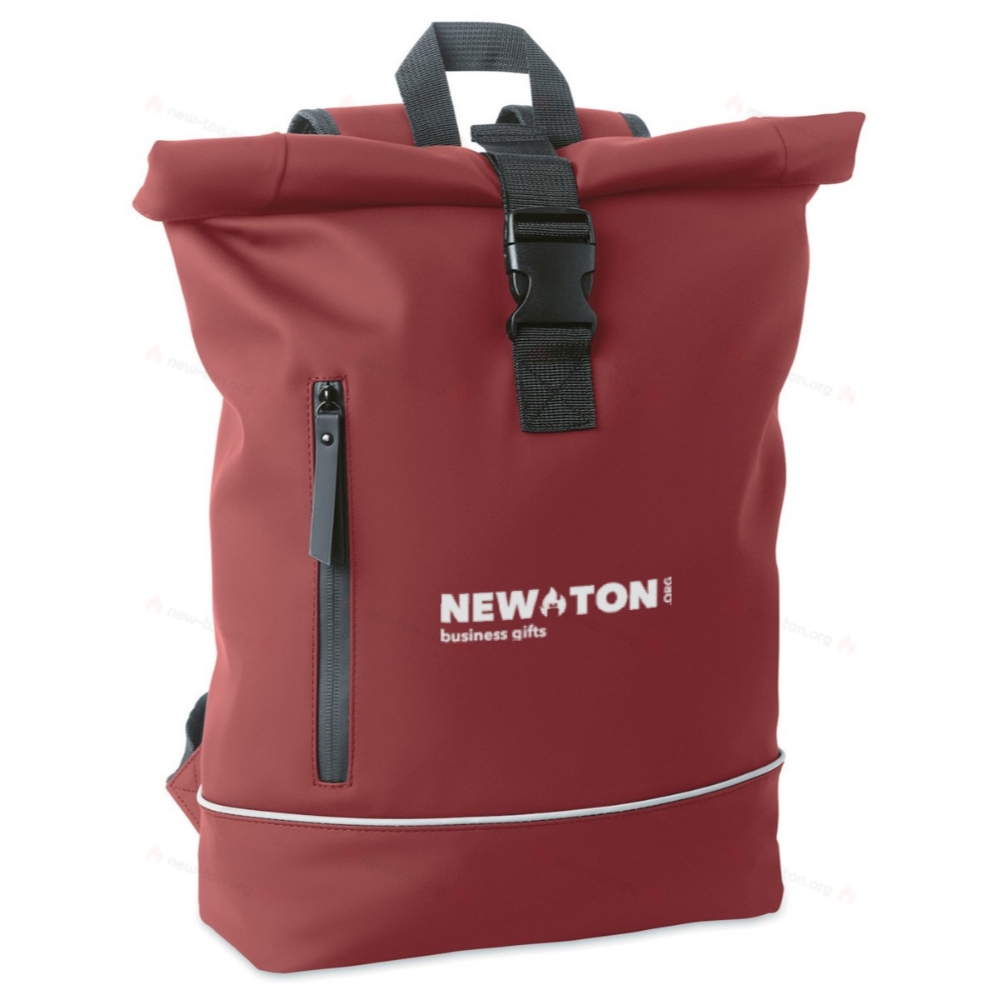 15 inch roll top laptop backpack in soft PU with padded back and base reinforcement with reflective strip. Waterproof zippered front pocket. 210D RPET polyester lining.