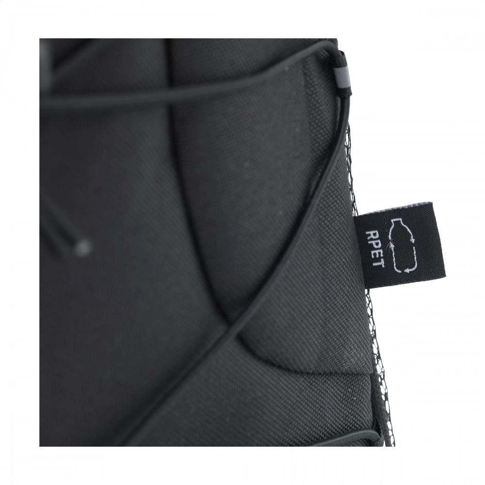 Рюкзак из прочного материала 600D RPET с двумя карманами на молнии. Просторное основное отделение оснащено карманами с защитной пеной, один из которых подходит для ноутбука с диагональю экрана до 15,6 дюймов. Другое отделение идеально подходит для хранения мелких аксессуаров, документов или блокнота. На боковой стороне рюкзака находится сетчатый карман для бутылки с водой, а на передней части рюкзака - удобная резинка, которая может использоваться для хранения куртки, свитера или другой одежды. Петля для переноски, регулируемые плечевые ремни и задняя часть рюкзака имеют мягкую пену для дополнительного комфорта. Полностью подкладочный, этот рюкзак украшен на передней части светоотражающими акцентами, что является отличной мерой безопасности при путешествиях в темное время суток. Сертифицирован GRS. Общий процент переработанных материалов: 97%. Объем примерно 20 литров.
