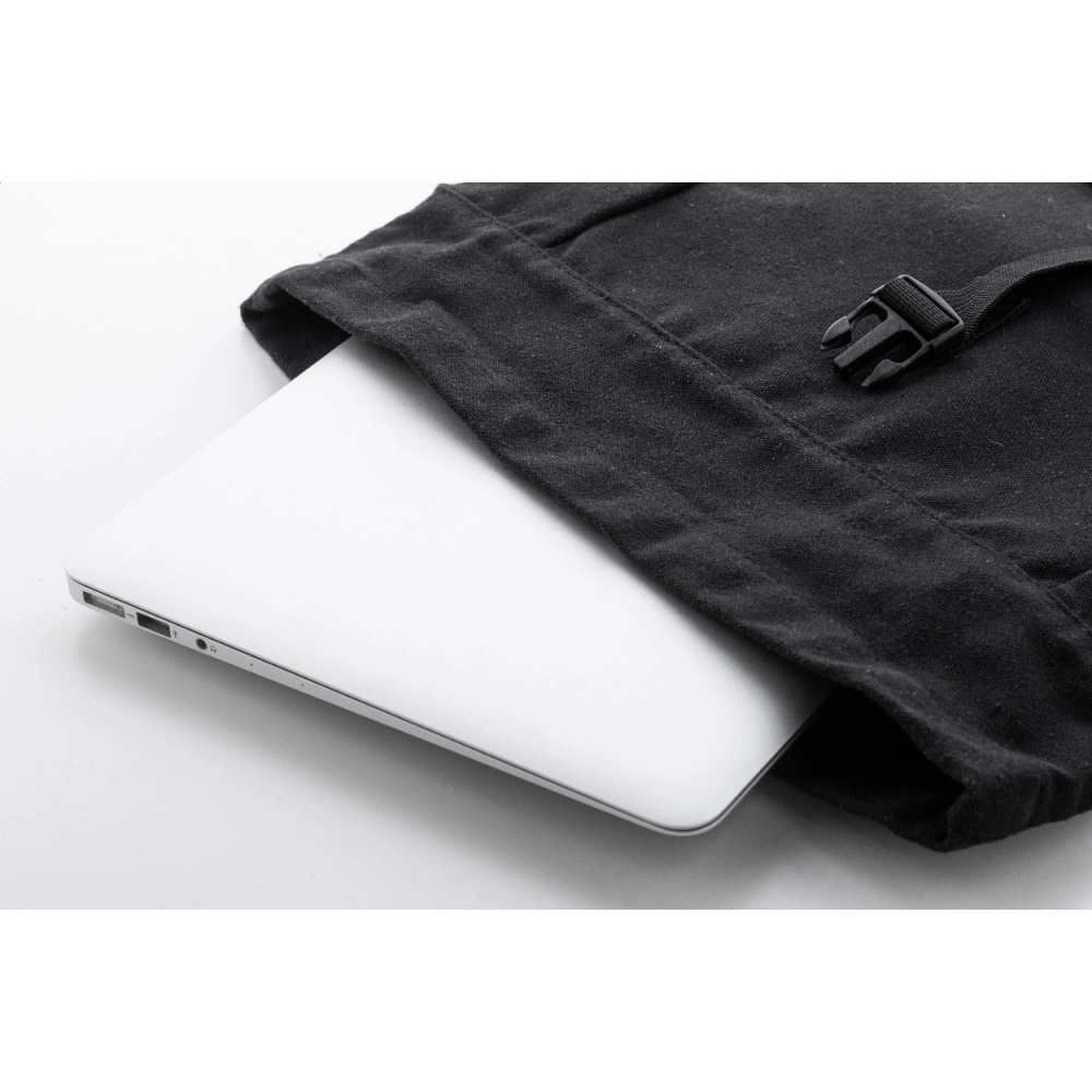 Рюкзак с открывающимся сверху клапаном из переработанного холста с застежкой на пряжку и карманом на молнии из мягкой переработанной кожи PU. С отделением для ноутбука (15 дюймов), боковыми карманами, мягкой спинкой и плечевыми ремнями. 70% переработанный хлопок и 30% полиэстер RPET. С характерным ярлыком из переработанного хлопка.