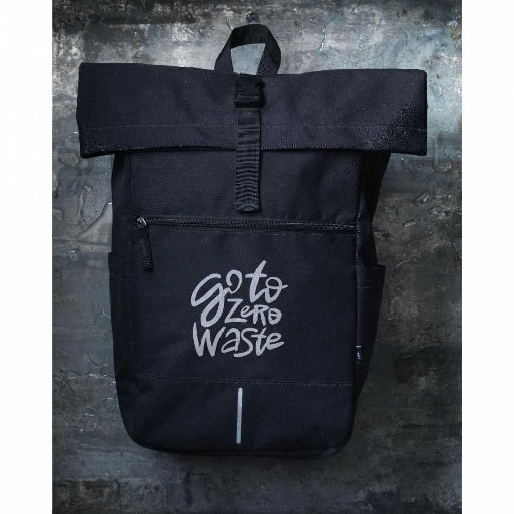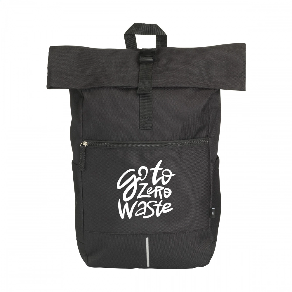 Практичный, прочный и водоотталкивающий городской рюкзак с верхним клапаном, изготовленный из RPET полиэстера (из переработанных ПЭТ-бутылок). Рюкзак имеет большое внутреннее отделение со специальным отделением для ноутбука (до 15,6 дюймов). На передней части находится карман на молнии с отражающей вставкой под ним (улучшает видимость в темноте). Оснащен двумя боковыми карманами, мягкой спинкой и регулируемыми плечевыми лямками с подкладкой для повышенного комфорта при ношении, ручкой для переноски и удобной застежкой с системой защелкивания сверху. Идеальная сумка для повседневного использования. Общий процент переработанных материалов: 51%. Объем около 20 литров.