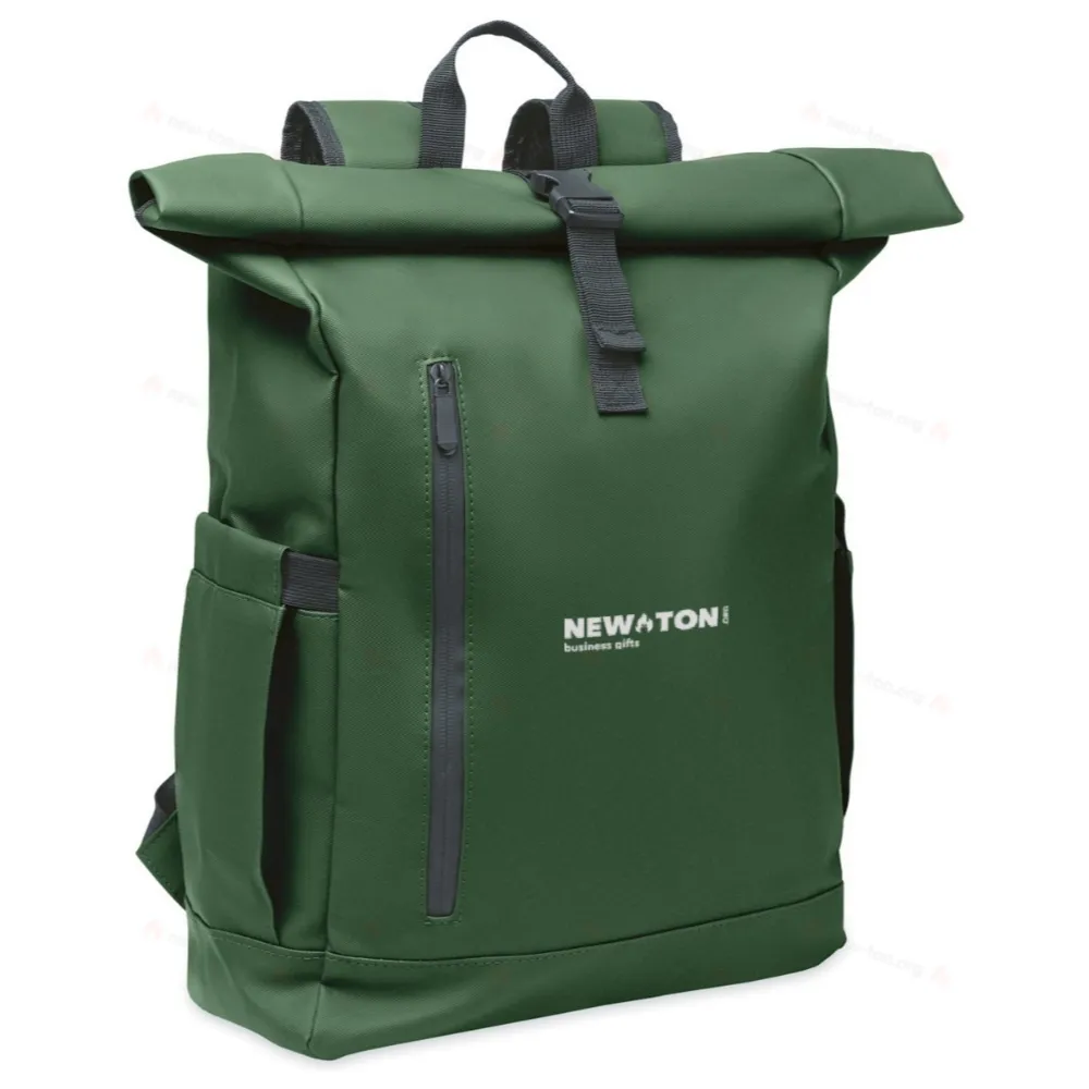 Рюкзак для ноутбука 15 дюймов из полиэстера RPET 600D с полиуретановым покрытием и подкладкой из полиэстера RPET. Сетчатая мягкая спинка с карманом на молнии и ремнем для переноски. Застежка ролл-топ. Мягкий плечевой ремень с сетчатой ​​отделкой внутри.