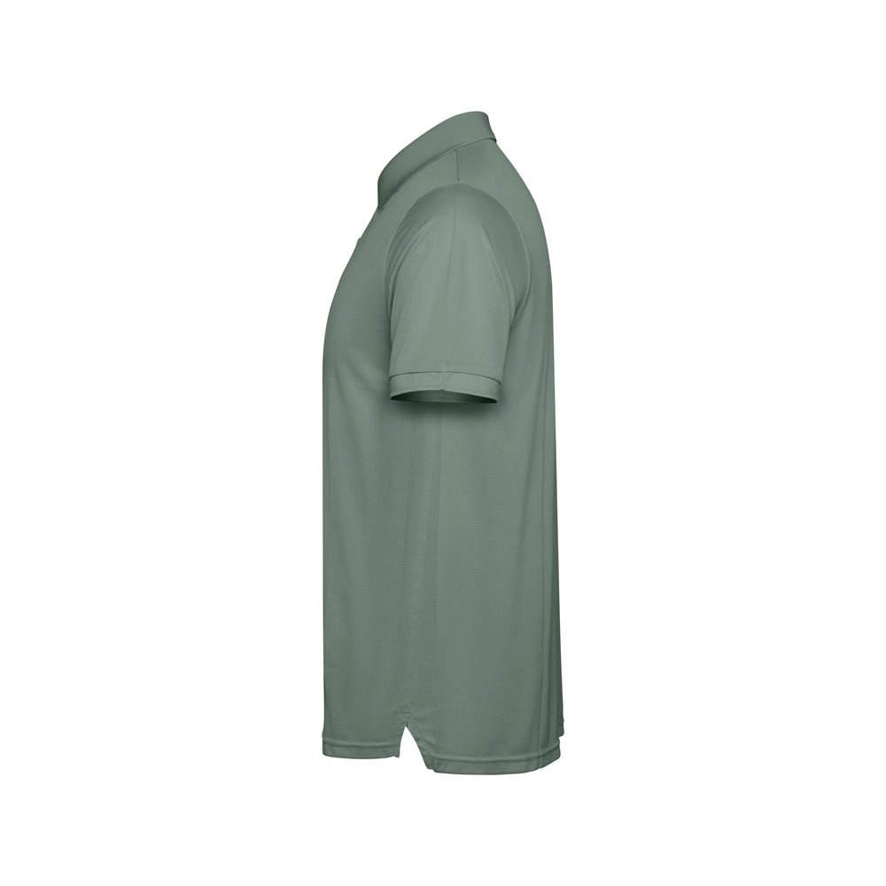 Мужское поло с коротким рукавом из технологичного полотна. Рибовый воротник 1х1, застежка на кнопки. Отстрочка в тон. Рибовые манжеты.