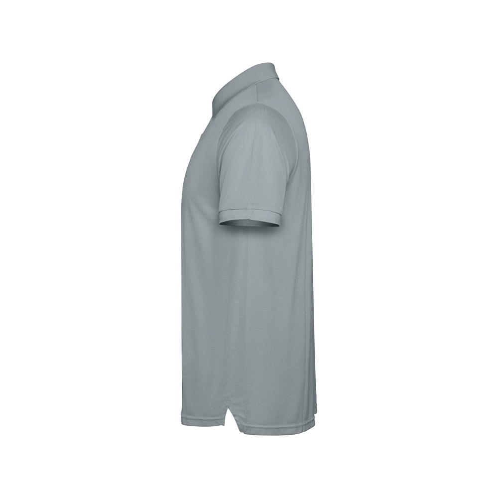 Мужское поло с коротким рукавом из технологичного полотна. Рибовый воротник 1х1, застежка на кнопки. Отстрочка в тон. Рибовые манжеты.