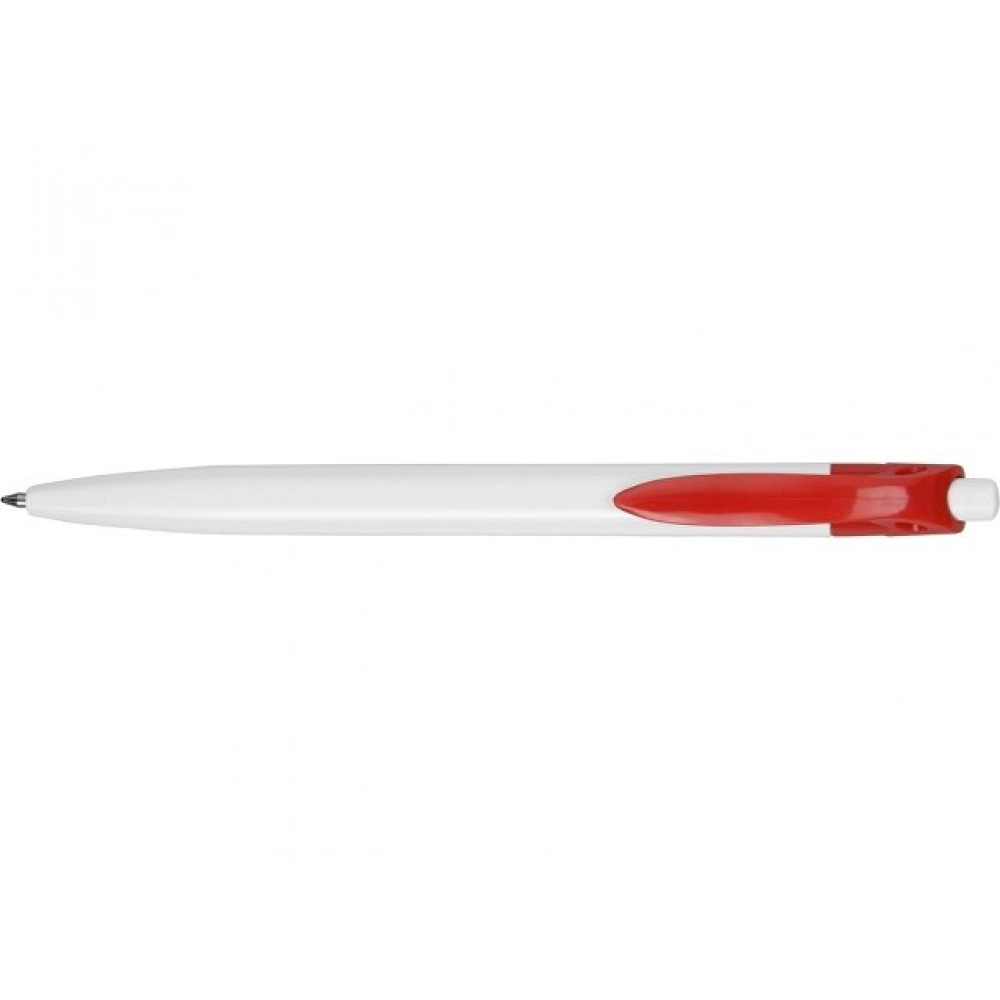 Стильная пластиковая ручка с ярким цветным клипом и белым корпусом отлично подойдет для нанесения логотипов и рекламной информации. Нажимной механизм.