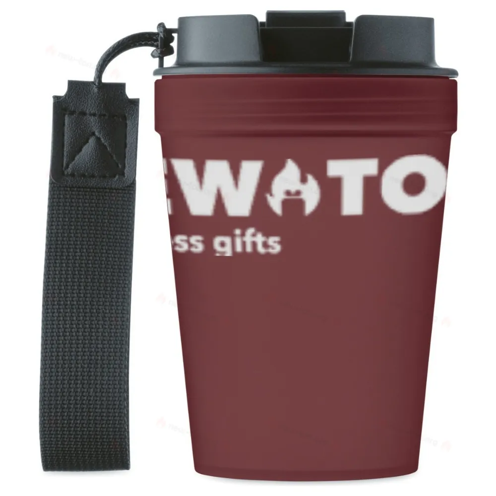Одностенная пластиковая термокружка с ремешком из полиэстера RPET. Герметичная. Емкость: 300 мл. Стенки кружки могут нагреваться.