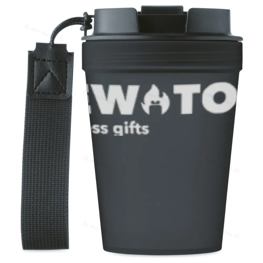 Одностенная пластиковая термокружка с ремешком из полиэстера RPET. Герметичная. Емкость: 300 мл. Стенки кружки могут нагреваться.
