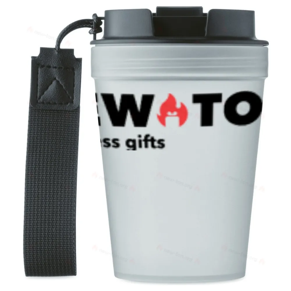 Одностенная пластиковая термокружка с ремешком из полиэстера RPET. Герметичная. Емкость: 300 мл. Стенки кружки могут нагреваться.