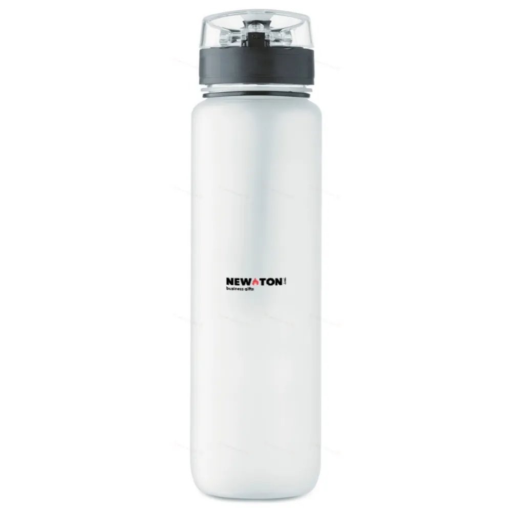 Спортивная бутылка из RPET с указанием графика потребления воды, откидной крышкой с предохранительным замком от открывания и ремешком для переноски. Герметичная. Емкость: 1 л.