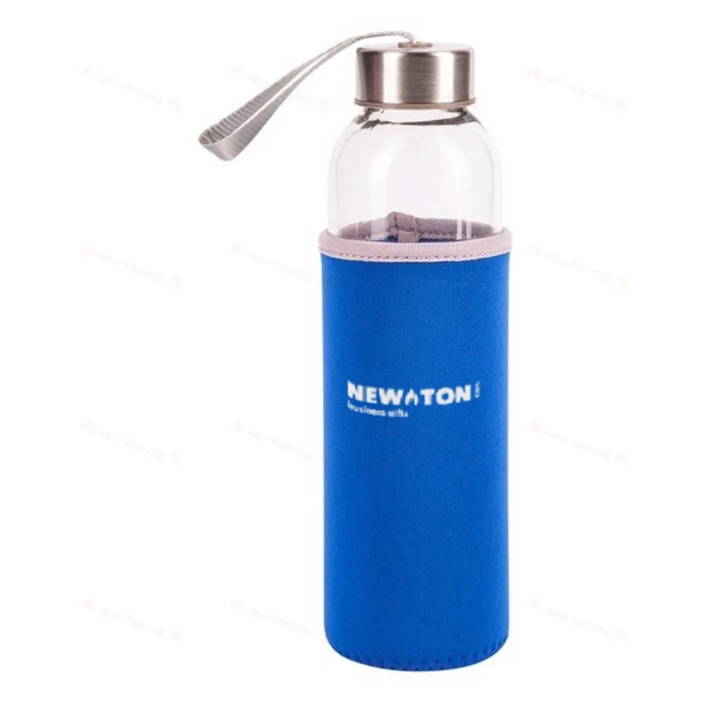 Плотно закрытая стеклянная бутылка объемом 500 мл, оснащенная неопреновым чехлом и ремешком на запястье.