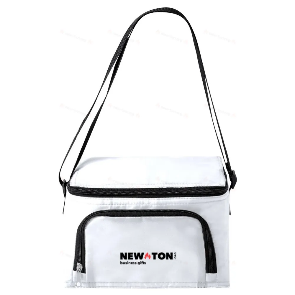 Полиэстеровая сумка-холодильник с застежками-молниями, алюминиевой подкладкой и плечевым ремнем. Вмещает 6 банок объемом 0,33 литра. Изготовлена из полиэстера 210D.