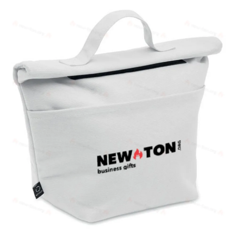 Сумка-холодильник из переработанного хлопка 70% и 30% переработанного полиэстера с застежкой ролтоп. Изоляция: 3 мм пенополиэтилен и 12C PEVA.