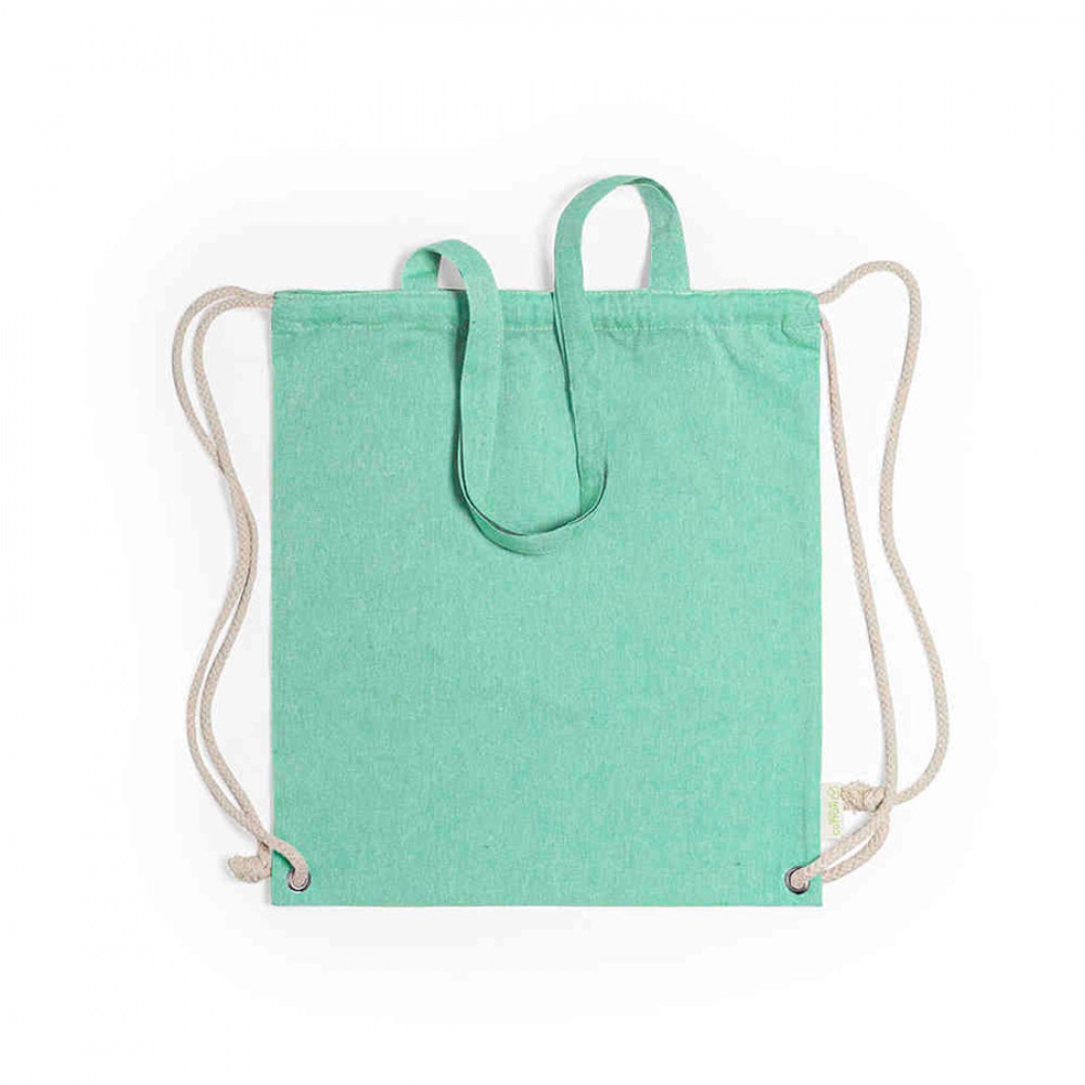 Сумка-рюкзак выполнен из 100% переработанного хлопка, плотностью 140 г м2. Близкий к Pantone Green 344 C Переработанный хлопок получается из отходов текстильного производства или из старой одежды. Исходный материал измельчается, потом из этой массы вытягивают нити, из которых ткут новую ткань.