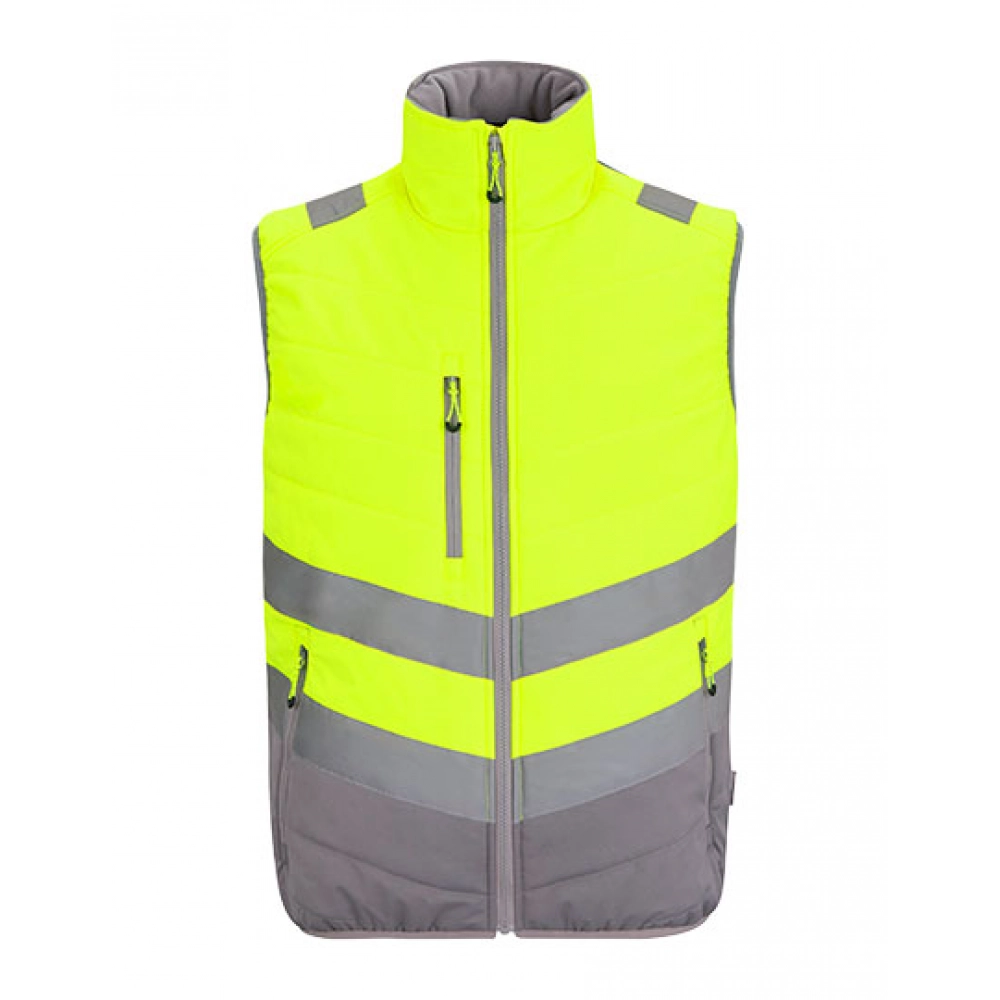 Терможилет с двухцветной высокой видимостью | Класс 1 | Дизайн с возможностью добавления украшений | 2 нижних и 1 нагрудный карман на молнии | Водоотталкивающее покрытие | Двухцветный серый дизайн | Изготовлен из переработанных материалов | Светоотражающая лента с направлением для идентификации.
