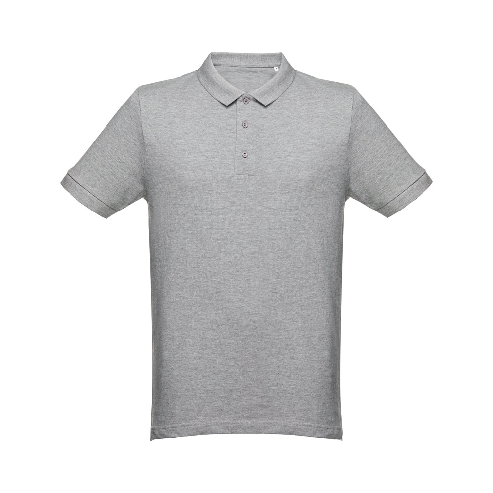 Мужское поло с короткими рукавами, изготовленное из 100% чесаного хлопка (240 г/м²) (цвет 183: 85% хлопок/15% вискоза). Стандартный крой с воротником и рукавами с лентой, а также усилением воротника из пике. Усиленный воротник с тремя пуговицами в тон (дополнительная пуговица вшита во внутренний шов). Изделие кроено и сшито с небольшими боковыми разрезами внизу поло. Видимая этикетка съемная. Размеры: S, M, L, XL, XXL.