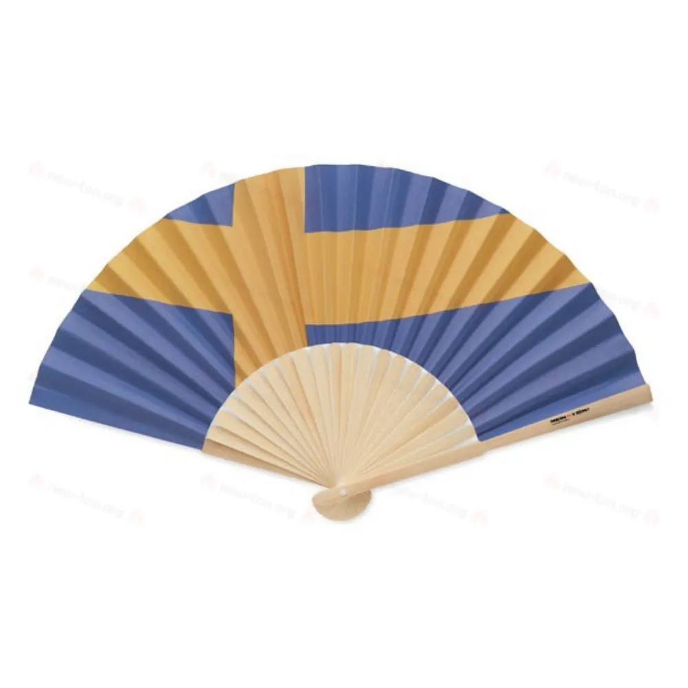 Веер с ручкой из бамбука и рисунком флага на ткани.