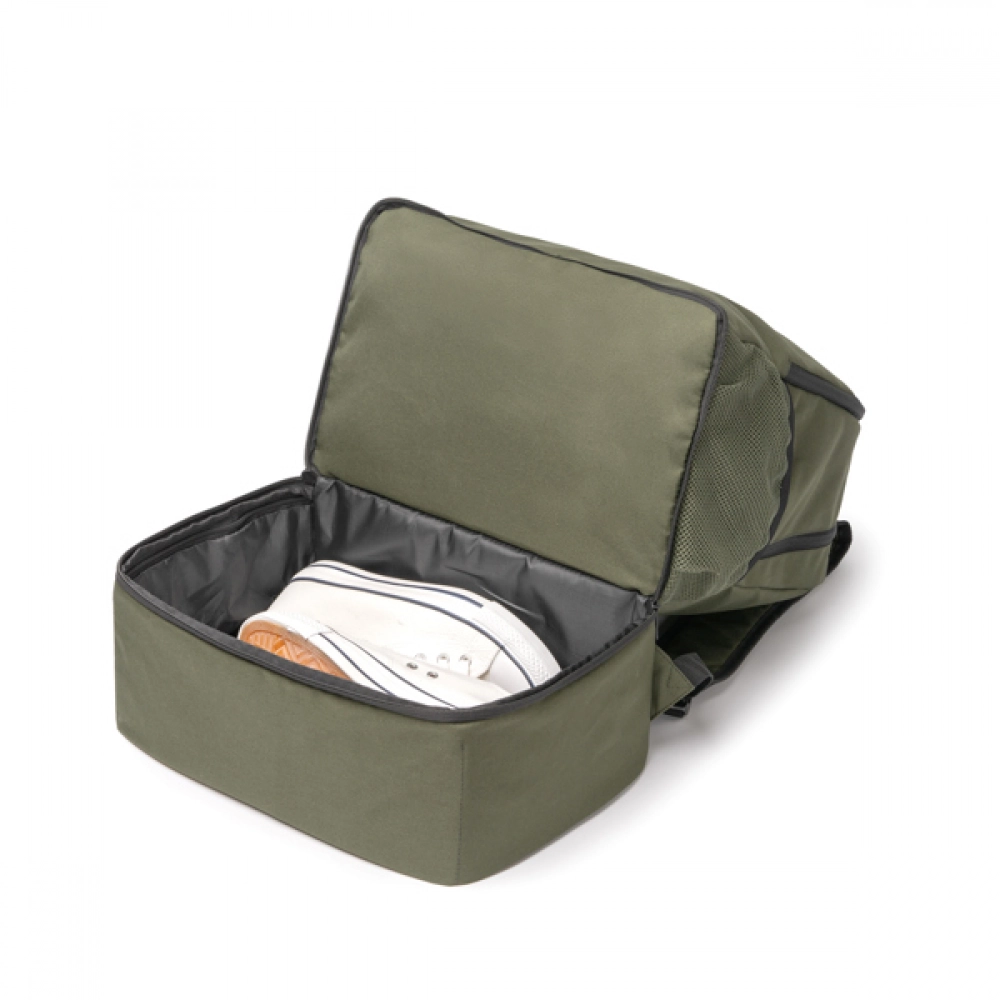 Спортивный рюкзак изготовлен из 600D RPET. Оснащен основным отделением с молнией и большим передним карманом. Есть боковой карман из сетчатой ткани с эластичной регулировкой для переноски бутылок. Внизу есть жесткий отделение для обуви, которое позволяет разделить вещи от остальной части рюкзака. Подкладка на спине и лямки делают использование более удобным.