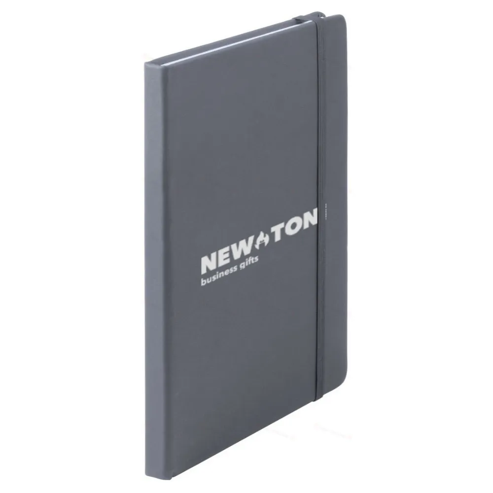 Блокнот в обложке из искусственной кожи со 100 чистыми листами, закладкой и резиновым ремешком.