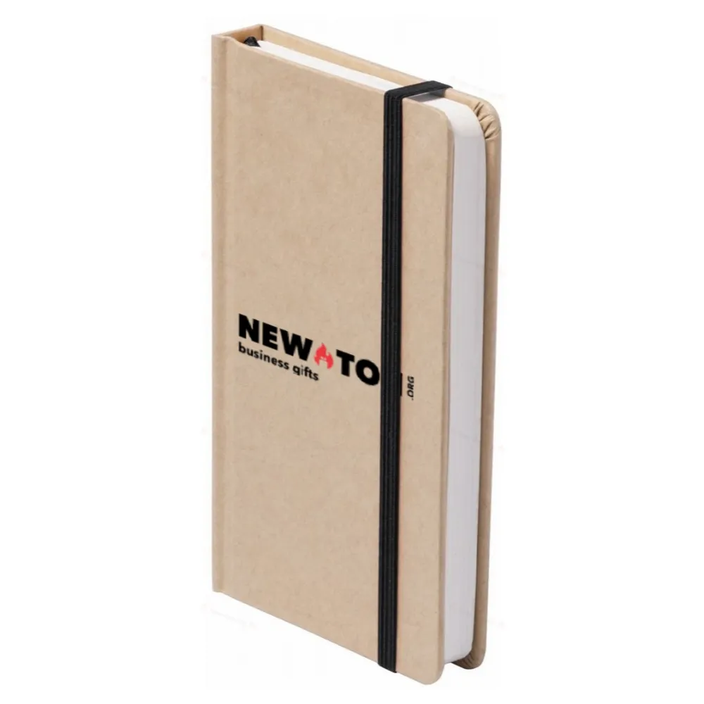 Блокнот в картонном переплете со 100 чистыми листами, цветной закладкой и резиновым ремешком.