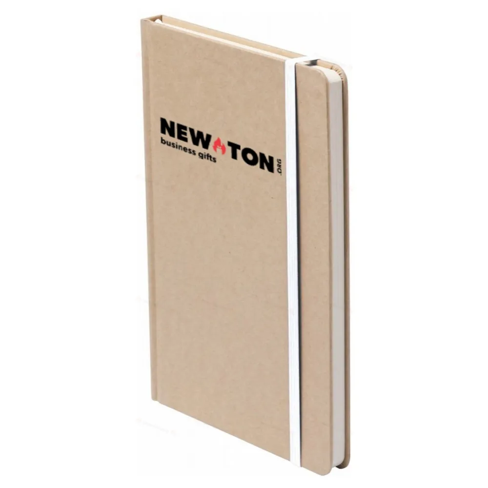 Блокнот в картонном переплете со 100 чистыми листами, цветной закладкой и резиновым ремешком.