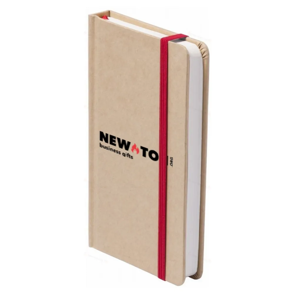 Блокнот в картонном переплете со 100 чистыми листами, цветной закладкой и резиновым ремешком.