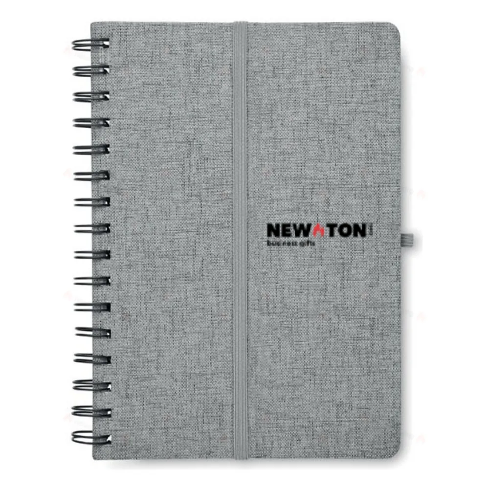 Блокнот A5 в твердой обложке с покрытием из 600D RPET с функцией подставки для смартфона. Двойная проволока. 160 линованных страниц (80 листов). Переработанная бумага 70 гсм. Эластичный ремешок.