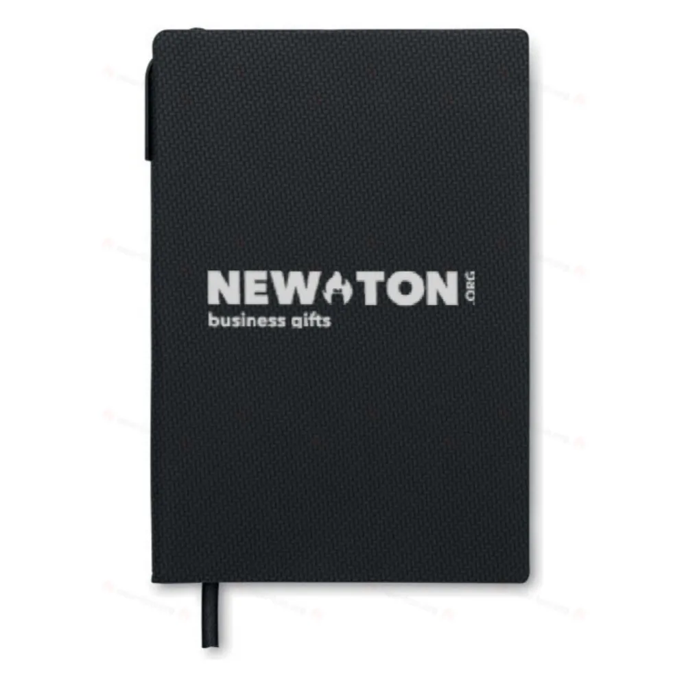 Блокнот формата A5 в обложке из полиуретана в комплекте с пластиковой шариковой ручкой. В переплете. 160 линованных страниц из переработанной бумаги (80 листов).