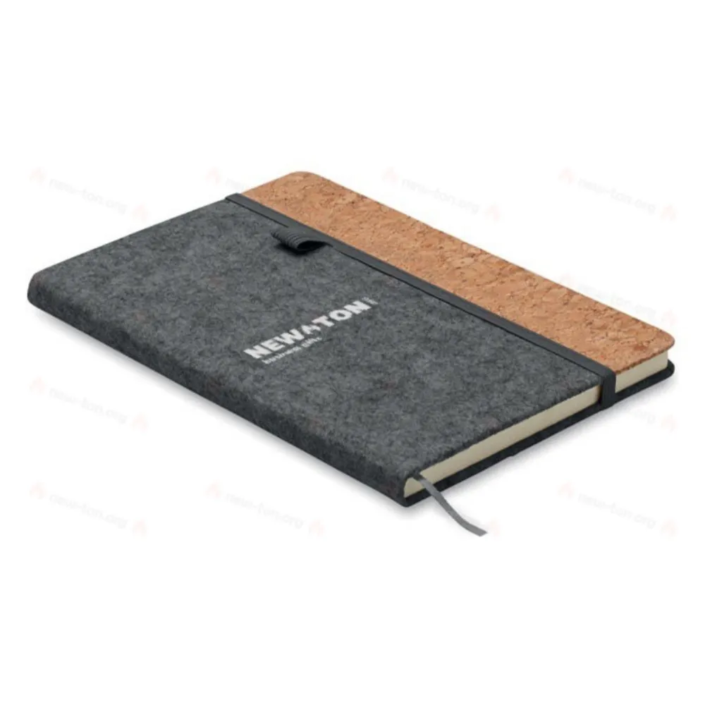 Блокнот A5 в обложке из переработанного войлока RPET и пробки. 160 линованных страниц из переработанной бумаги (80 листов). Есть петля для ручки на лицевой стороне и закладка. Закрывается на эластичный ремешок. FSC MIX 100% | P7.1 | FSC-C213206