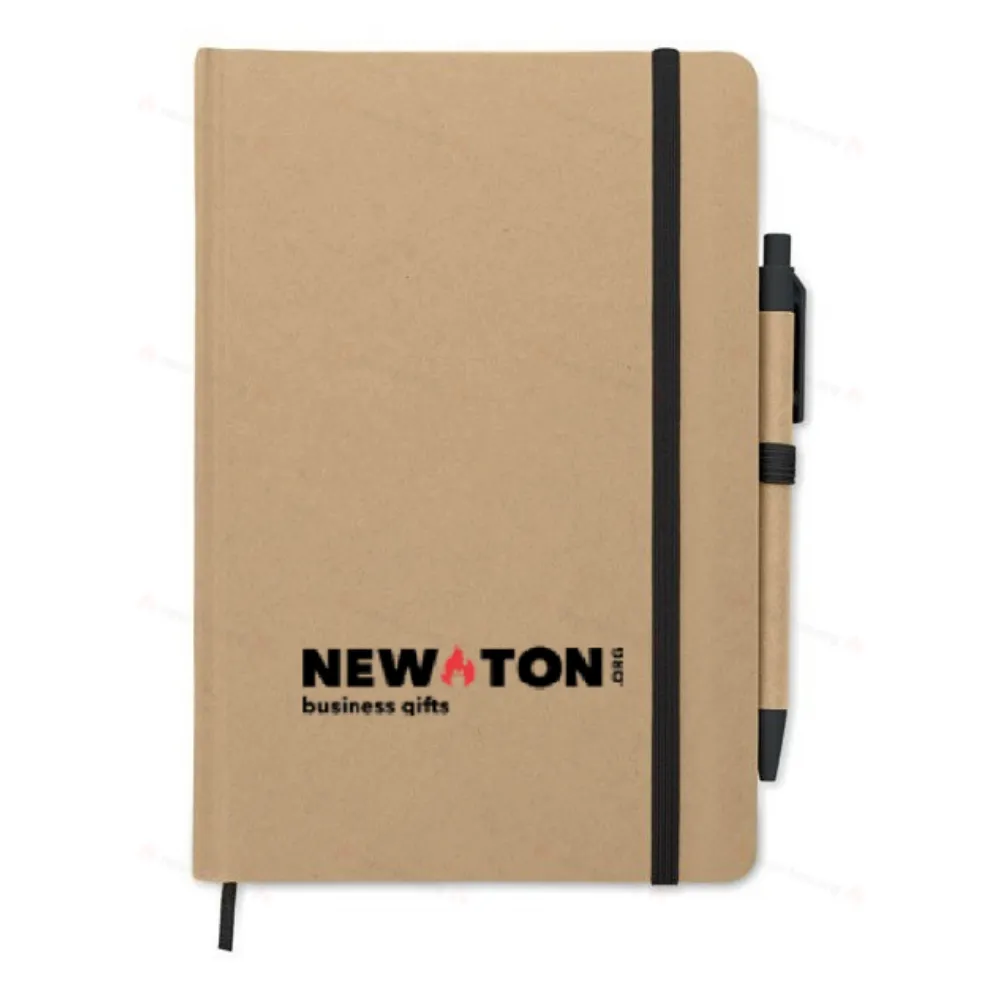 Блокнот формата А5 в твердой обложке из переработанного картона. В переплете. 160 линованных страниц (80 листов из переработанной бумаги). В комплект входит кнопочная шариковая ручка из переработанной бумаги. Синие чернила.