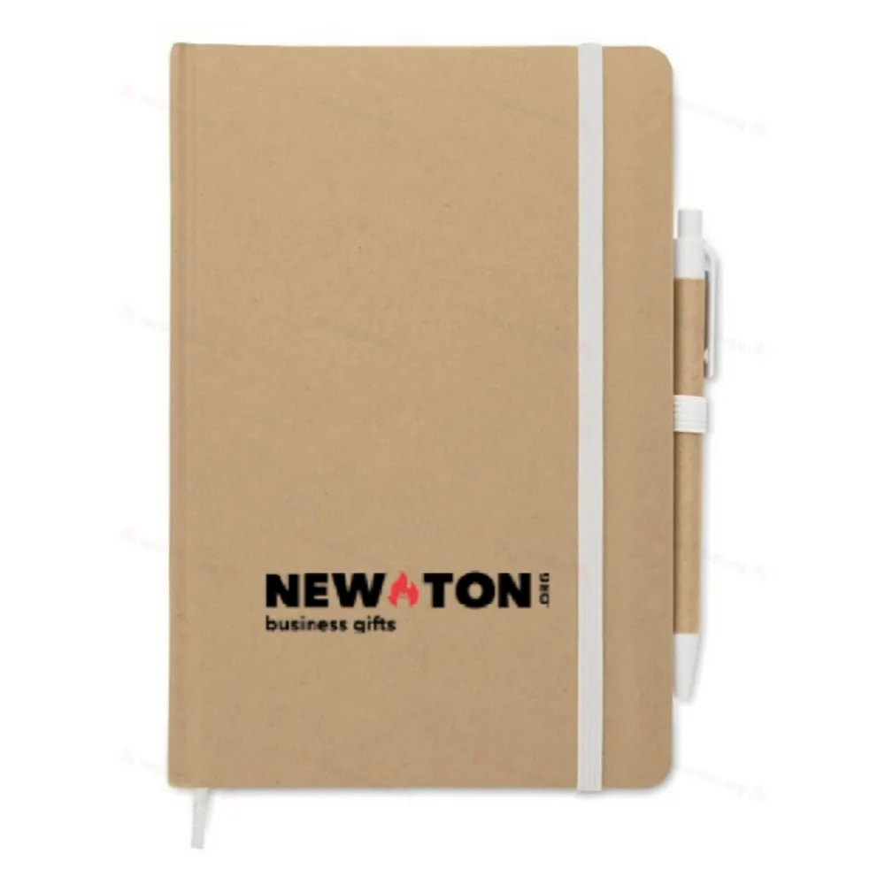 Блокнот формата А5 в твердой обложке из переработанного картона. В переплете. 160 линованных страниц (80 листов из переработанной бумаги). В комплект входит кнопочная шариковая ручка из переработанной бумаги. Синие чернила.