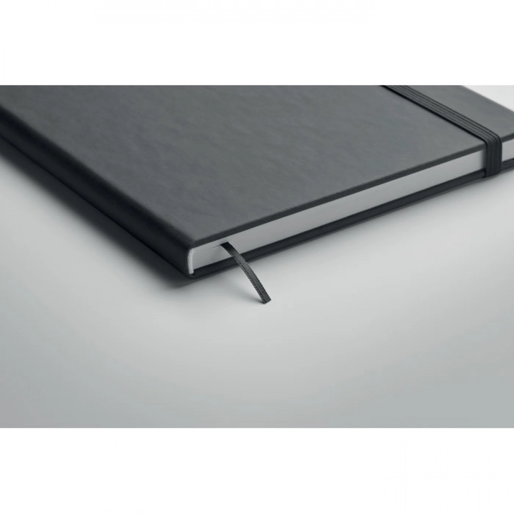 Блокнот формата A5 с твердой обложкой из полиуретана. В переплете. 200 линованные страницы (100 листов) из переработанной бумаги (80 гсм). Соответствующий эластичный ремешок и ленточный маркер для страниц. Сделано в ЕС.