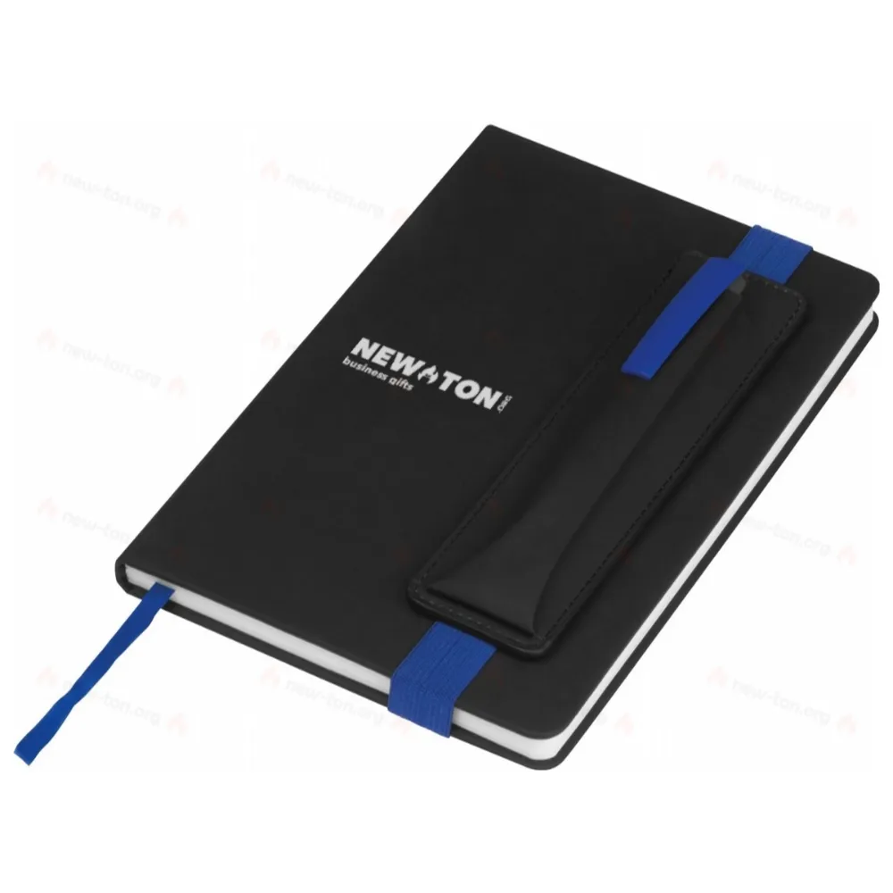 Блокнот формата A5 с обложкой из полиуретана, 192 линованными страницами, закладкой и резинкой для закрытия, а также держателем для ручки. На блокнот будет нанесен ваш логотип.