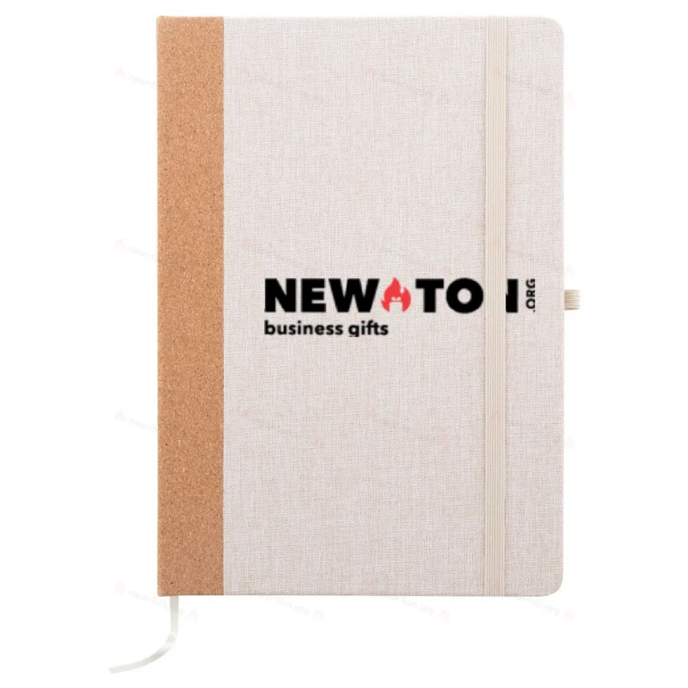 Блокнот с обложкой из переработанного полиэстера с натуральным пробковым позвоночником и 80 линованными листами из переработанной бумаги. С закладкой, резиновым ремешком и держателем для ручки. Размер A5.