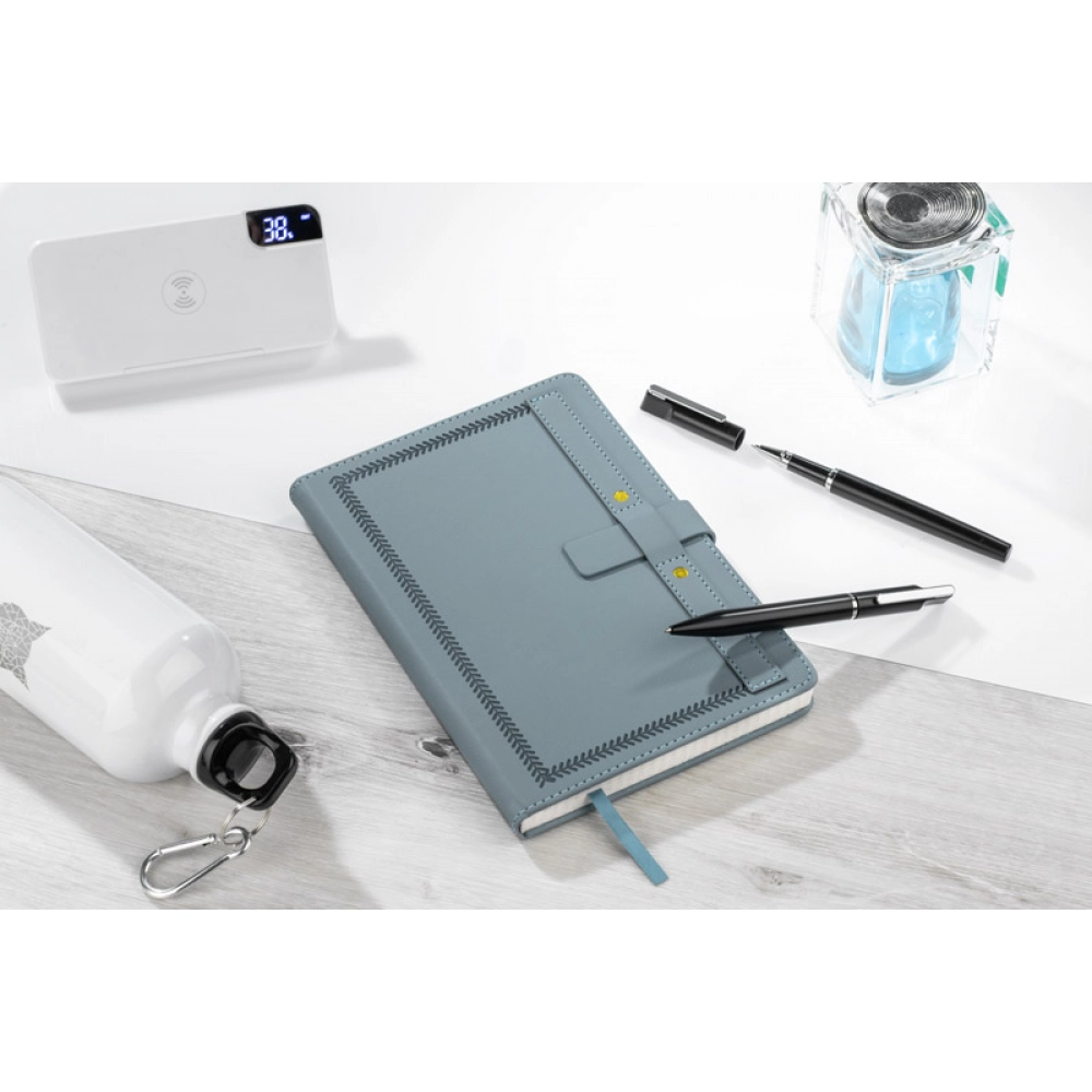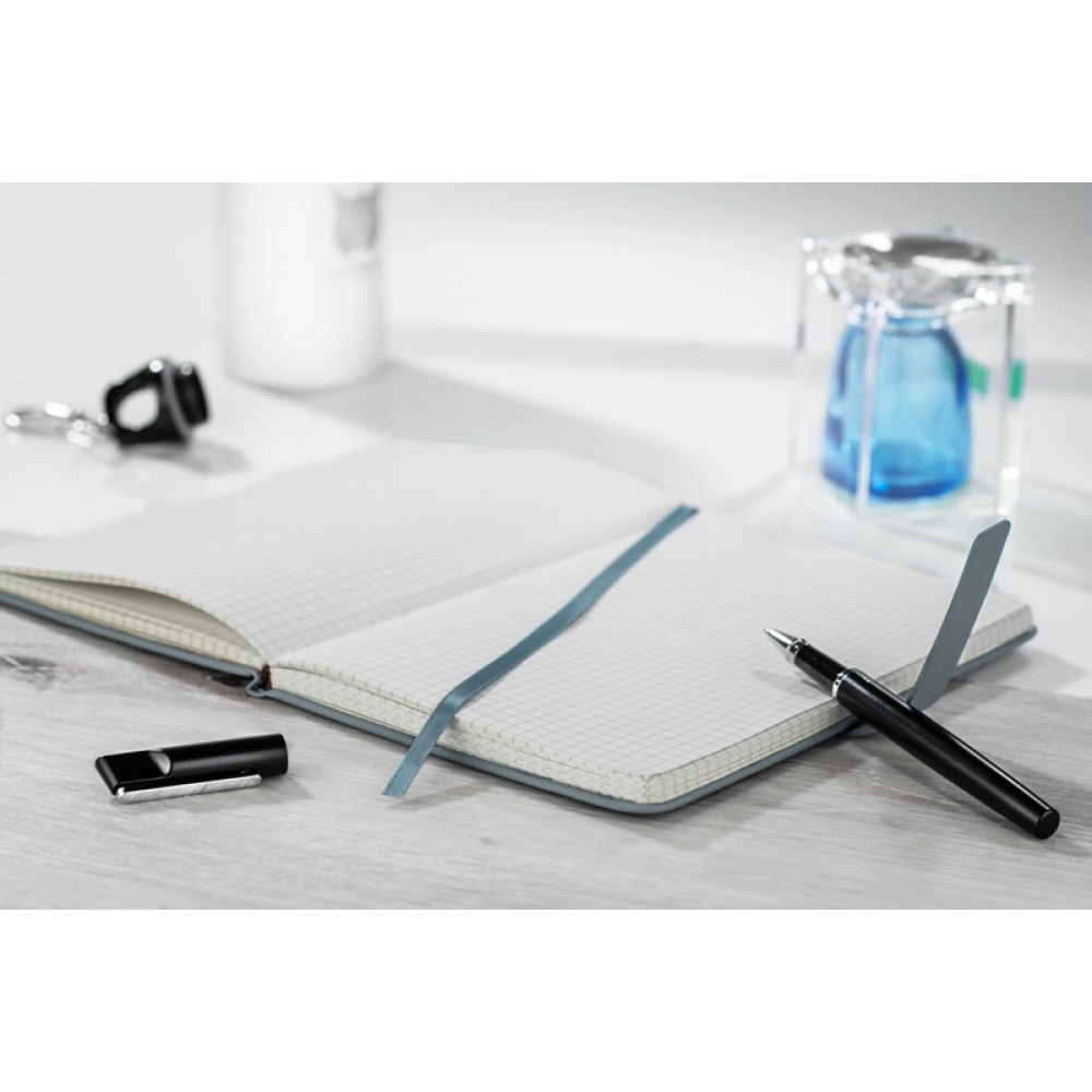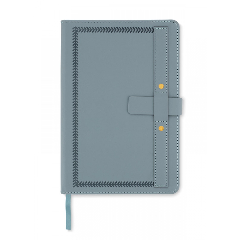 Блокнот SCRIBO формата A5 — это элегантный блокнот с 104 клетчатыми страницами, идеально подходящий для повседневного использования. Твердая обложка из материала, напоминающего кожу, выделяется декоративным тиснением, строчкой и характерным ремешком с декоративными заклепками. Блокнот закрывается с помощью ремешка, который защищает содержимое от случайного открытия. Кроме того, он оснащен лентой для закладки страниц. Отлично подходит в качестве рекламного сувенира с возможностью нанесения бренда.