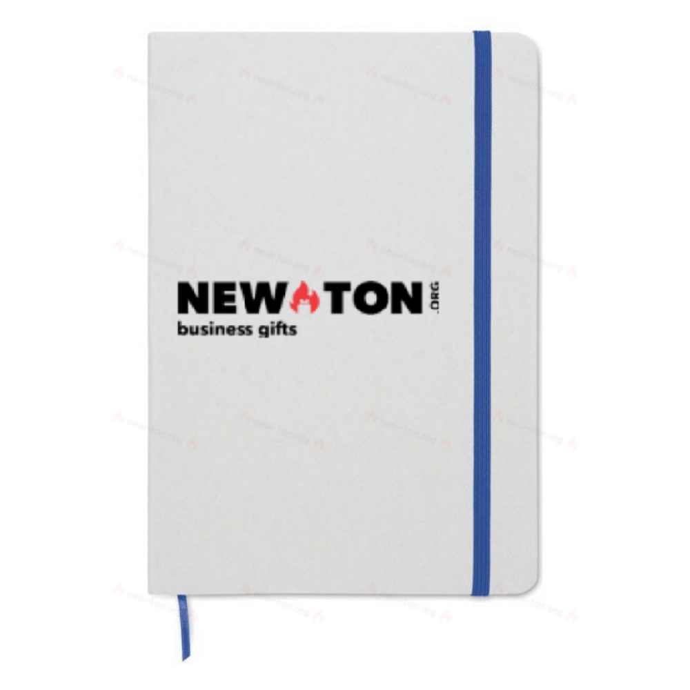 A5 notebook with hard recycled carton cover. White cover. Casebound. 160 lined recycled paper pages (80 sheets). Elastic closure strap, ribbon bookmark matching with revealed colour. After laser engraving the colour is revealed.