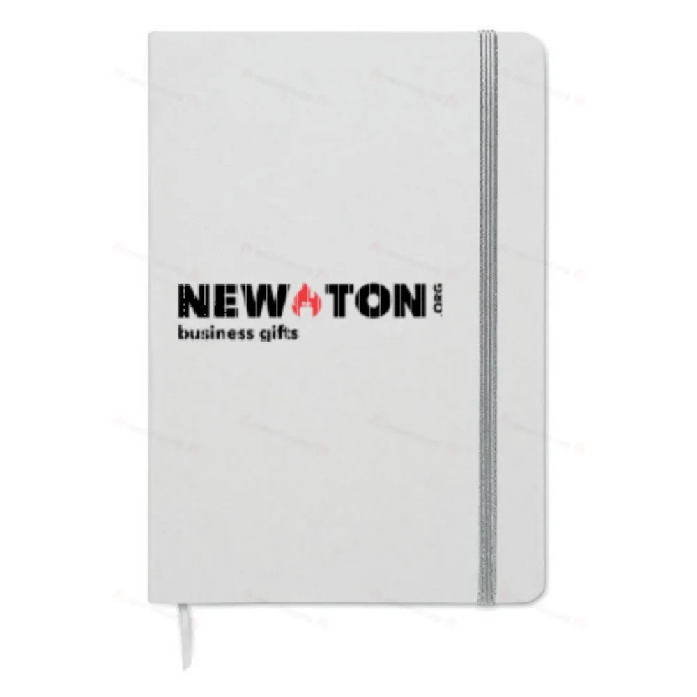 Блокнот A5 в твердой белой обложке из переработанного картона. В переплете. 160 линованных страниц из переработанной бумаги (80 листов). В результате гравировки на обложке лого вскрывается цветом эластичного ремешка и закладки.