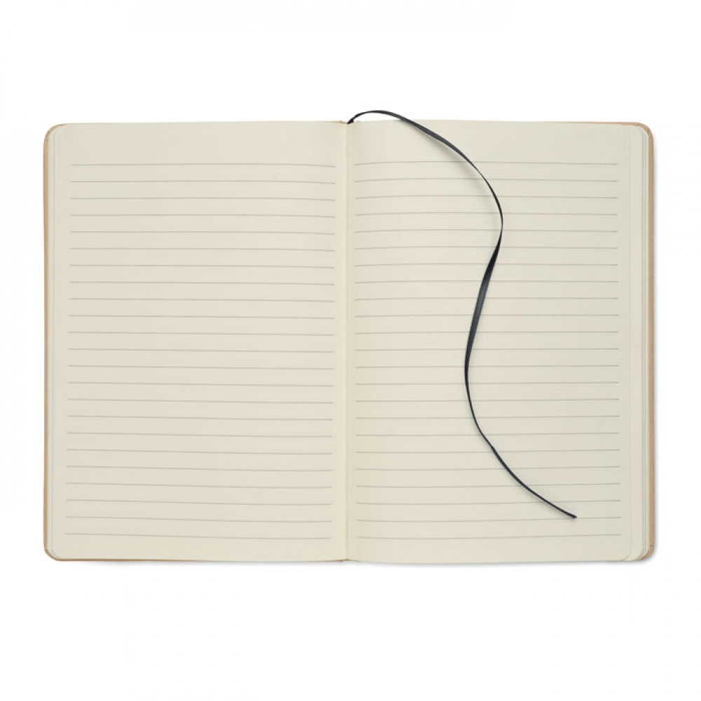 A5 notebook with hard recycled carton cover. Beige cover. Case bound. 160 lined recycled paper pages (80 sheets). Elastic closure strap, ribbon bookmark matching with revealed colour. After laser engraving the colour is revealed.