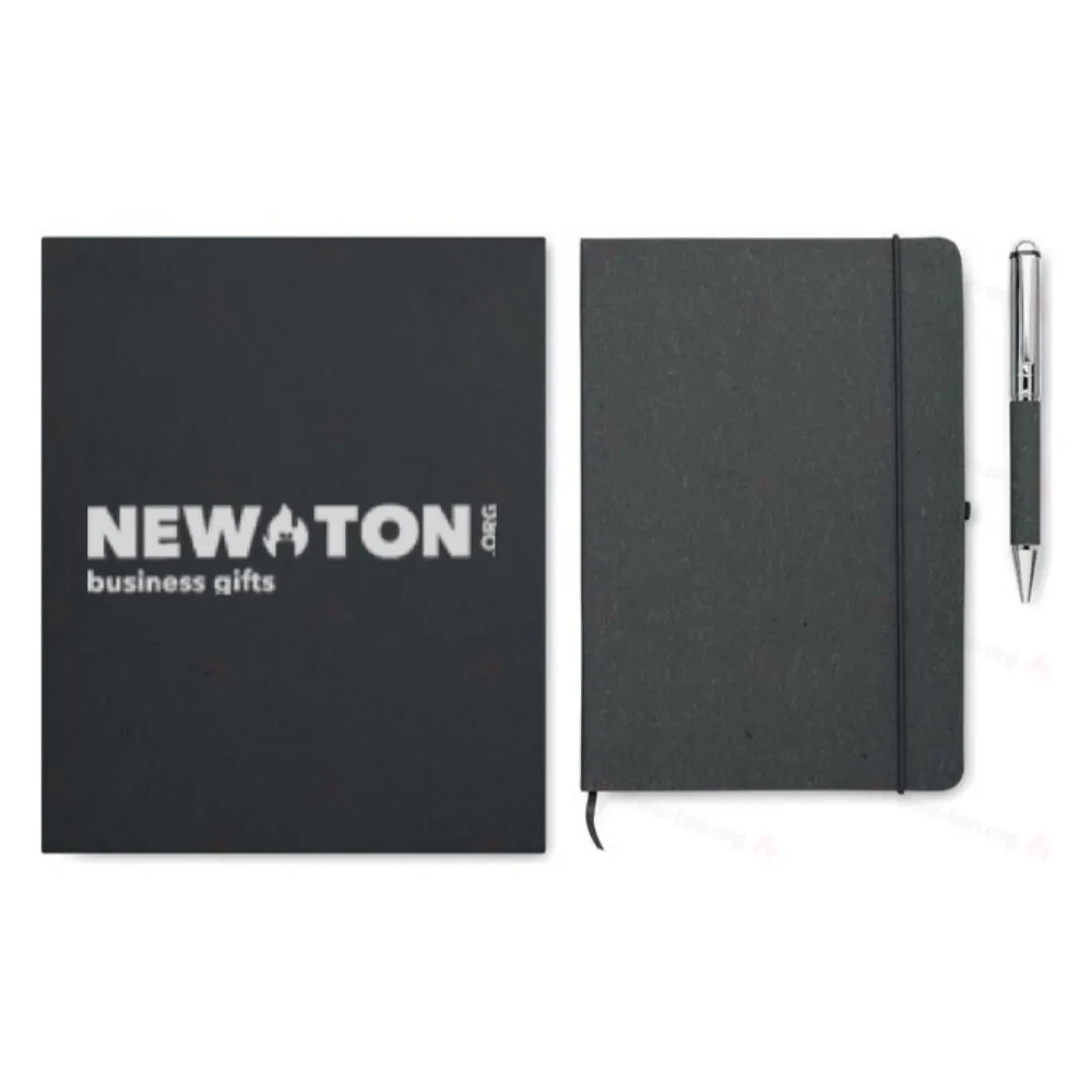 Подарочный набор: блокнот А5 в твердой обложке из переработанной кожи (75%) в переплете (160 линованных страниц (80 листов), эластичный ремешок, закладка и держатель для ручки) и металлическая ручка (синие чернила). Поставляется в крафтовой коробке. FSC®-certified | FSC MIX CREDIT, P7.1, FSC-C213206
