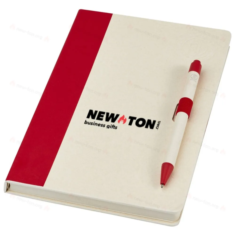 Набор из блокнота формата A5 и шариковой ручки. Блокнот содержит 80 линованных листов (80 г/м²), изготовленных из переработанных молочных пакетов (до 70%), имеет цветной переплет и петлю для ручки. В петле находится шариковая ручка с нажимным механизмом, выполненная в цвет блокнота. Корпус ручки изготовлен из того же переработанного материала, что и блокнот, а кнопка, клип и наконечник выполнены из цветного PLA-пластика. Ручка оснащена черным стержнем. Использованные молочные пакеты собираются, сортируются, перерабатываются и превращаются в бумагу, действительно превращая отходы в полезные вещи.