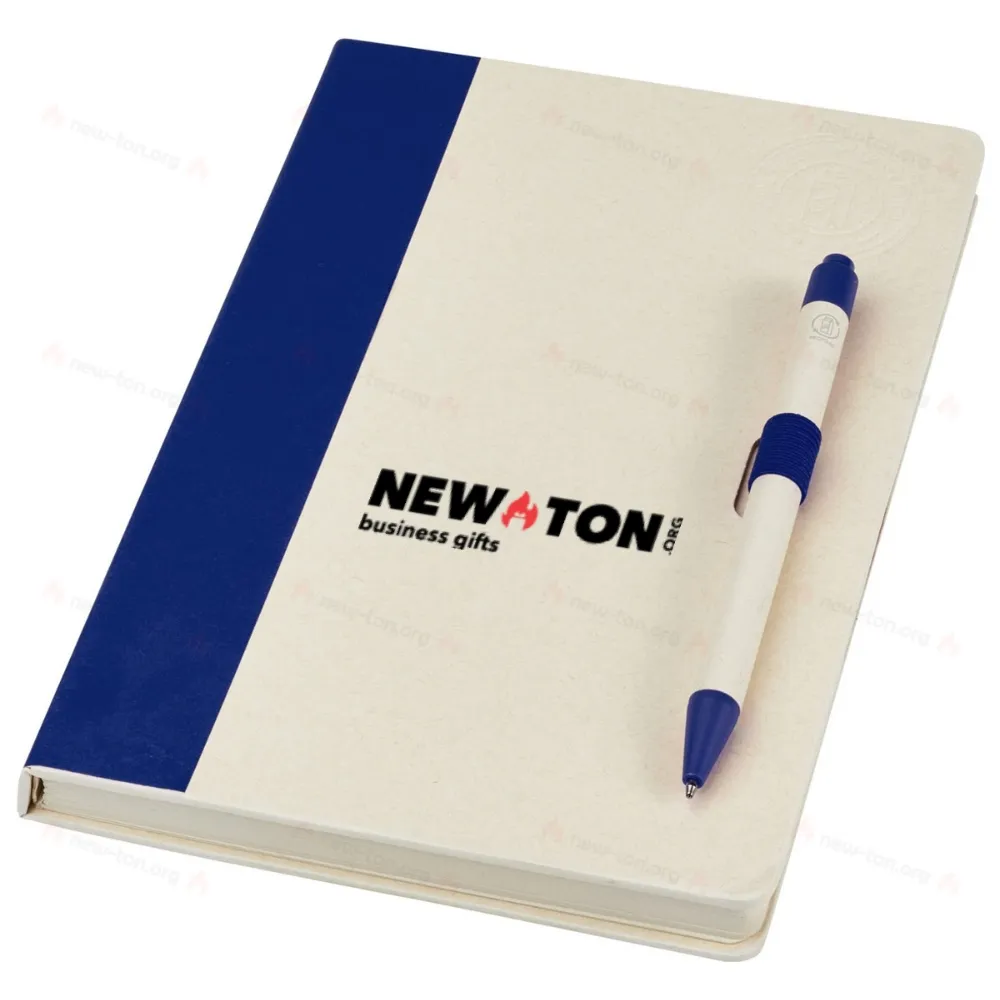 Набор из блокнота формата A5 и шариковой ручки. Блокнот содержит 80 линованных листов (80 г/м²), изготовленных из переработанных молочных пакетов (до 70%), имеет цветной переплет и петлю для ручки. В петле находится шариковая ручка с нажимным механизмом, выполненная в цвет блокнота. Корпус ручки изготовлен из того же переработанного материала, что и блокнот, а кнопка, клип и наконечник выполнены из цветного PLA-пластика. Ручка оснащена черным стержнем. Использованные молочные пакеты собираются, сортируются, перерабатываются и превращаются в бумагу, действительно превращая отходы в полезные вещи.