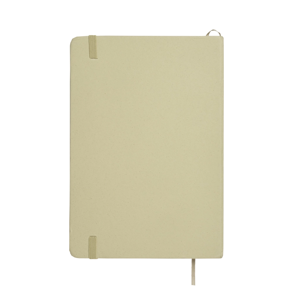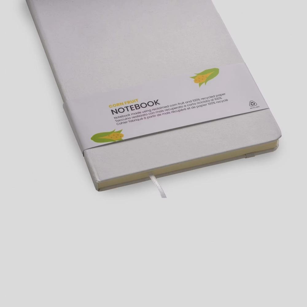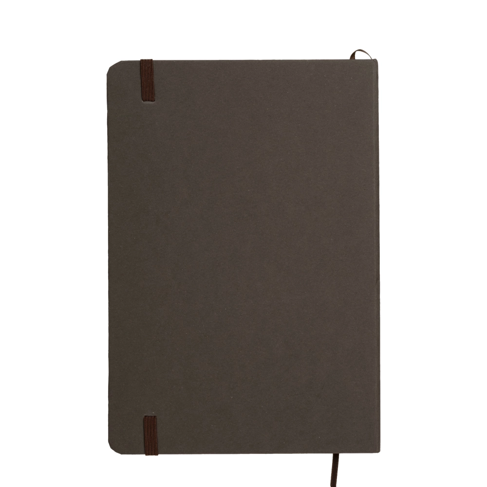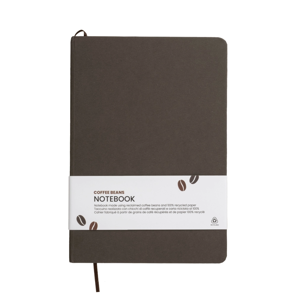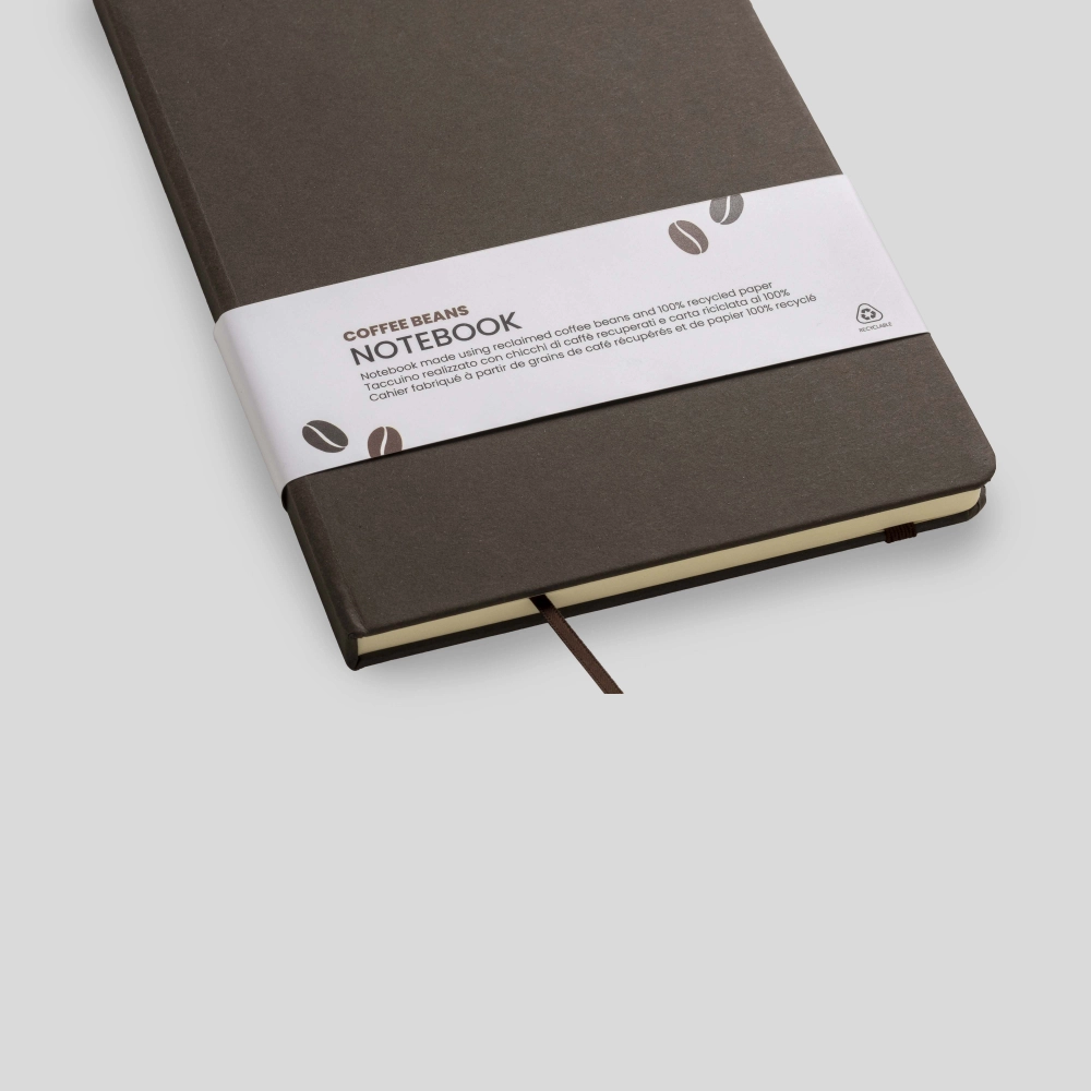 Блокнот с обложкой из остатков кофейных зерен, вишни, лаванды, лимона, кукурузы и киви. Листы в полоску из переработанной бумаги цвета слоновой кости (80 страниц), застежка на резинке и атласная закладка в тон.