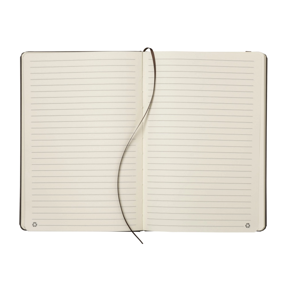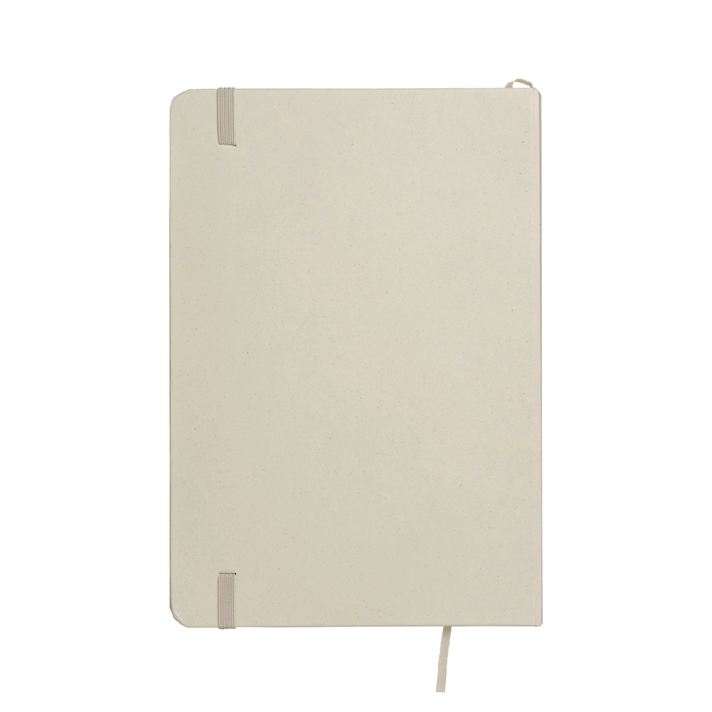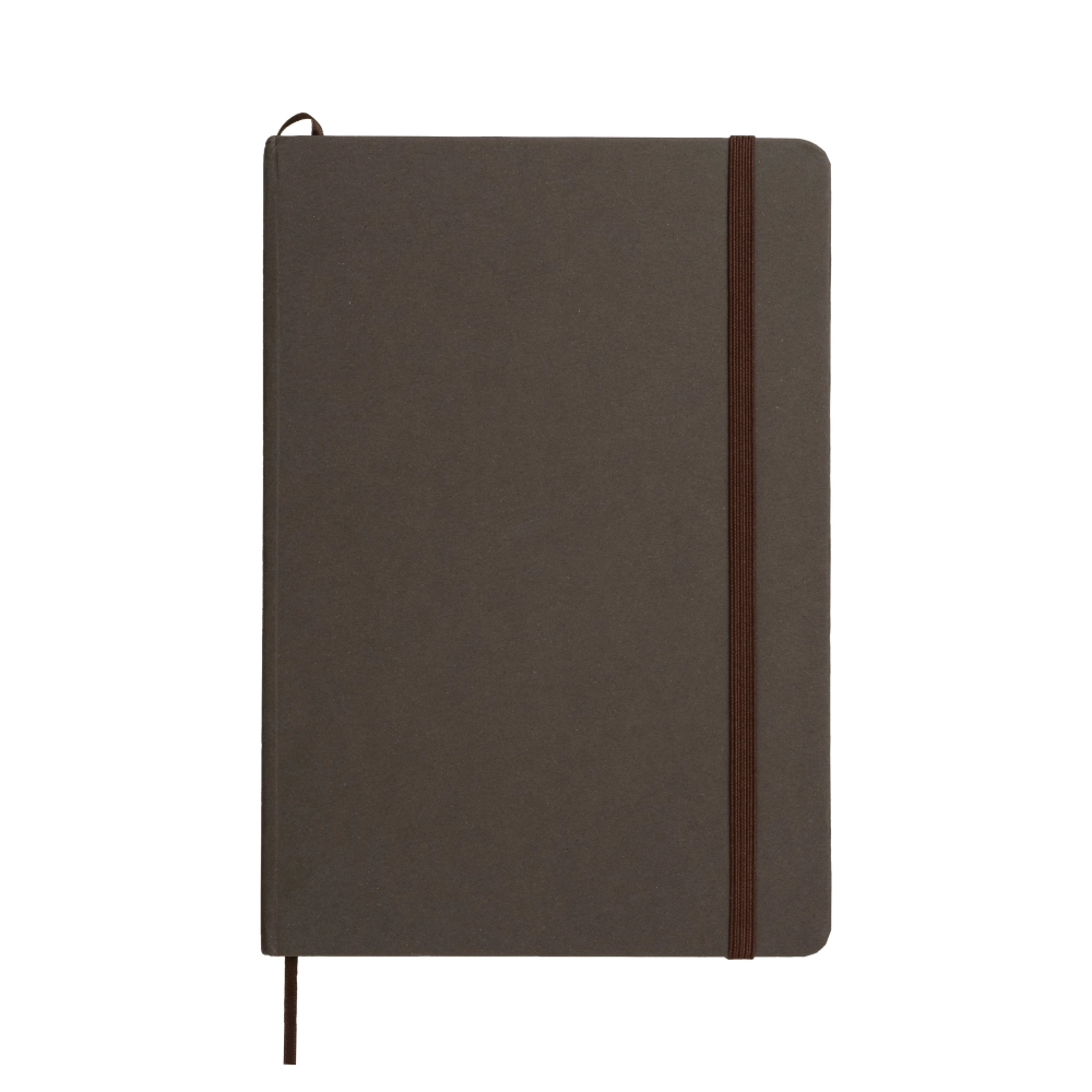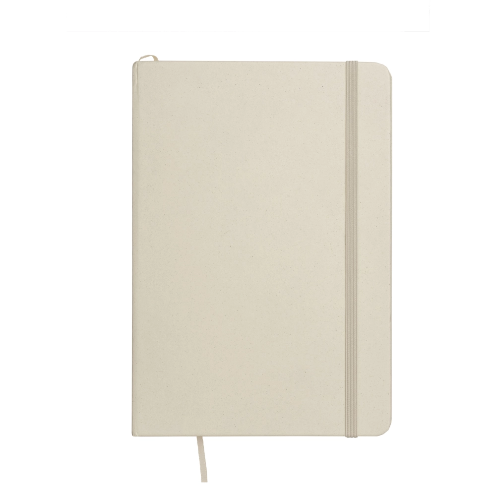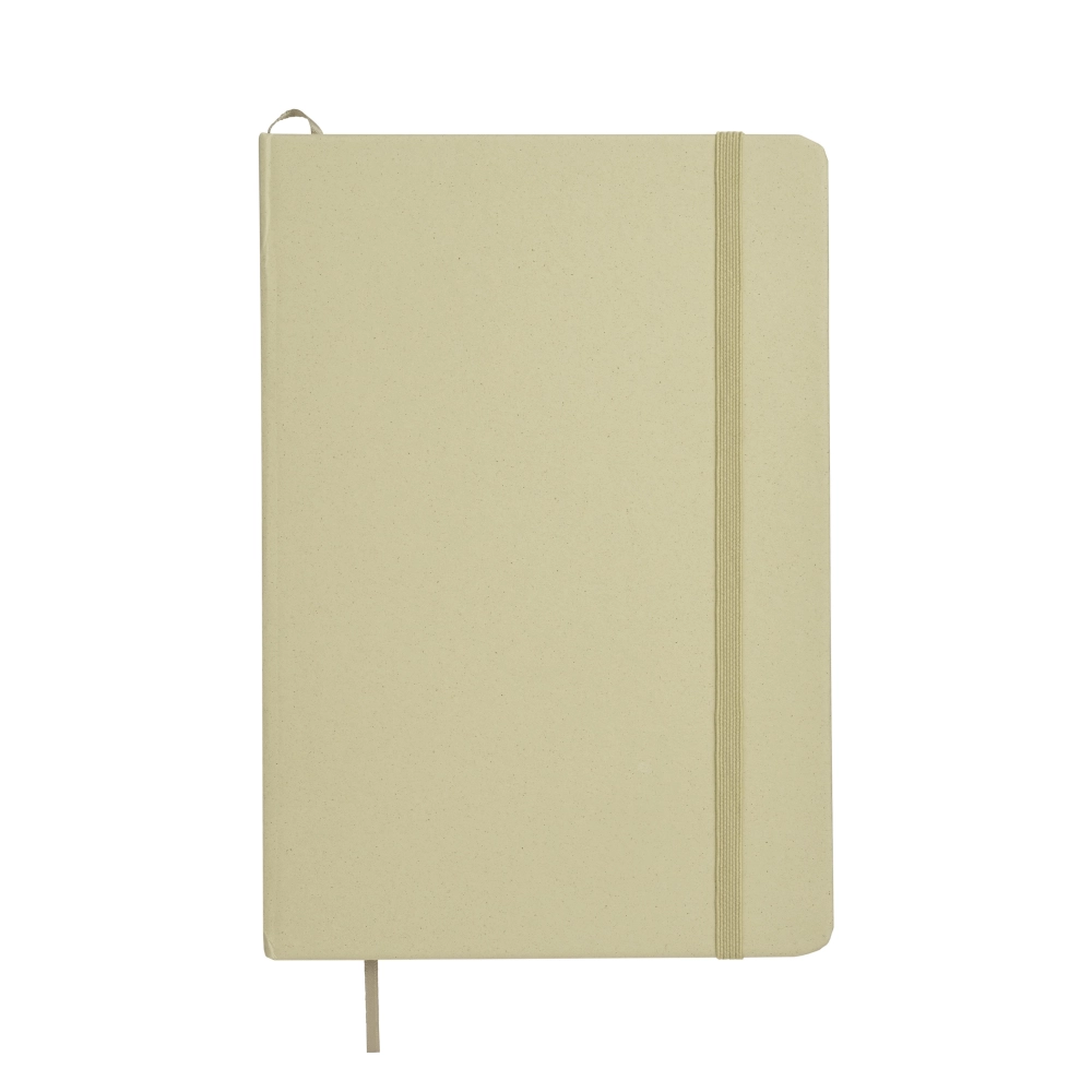 Блокнот с обложкой из остатков кофейных зерен, вишни, лаванды, лимона, кукурузы и киви. Листы в полоску из переработанной бумаги цвета слоновой кости (80 страниц), застежка на резинке и атласная закладка в тон.
