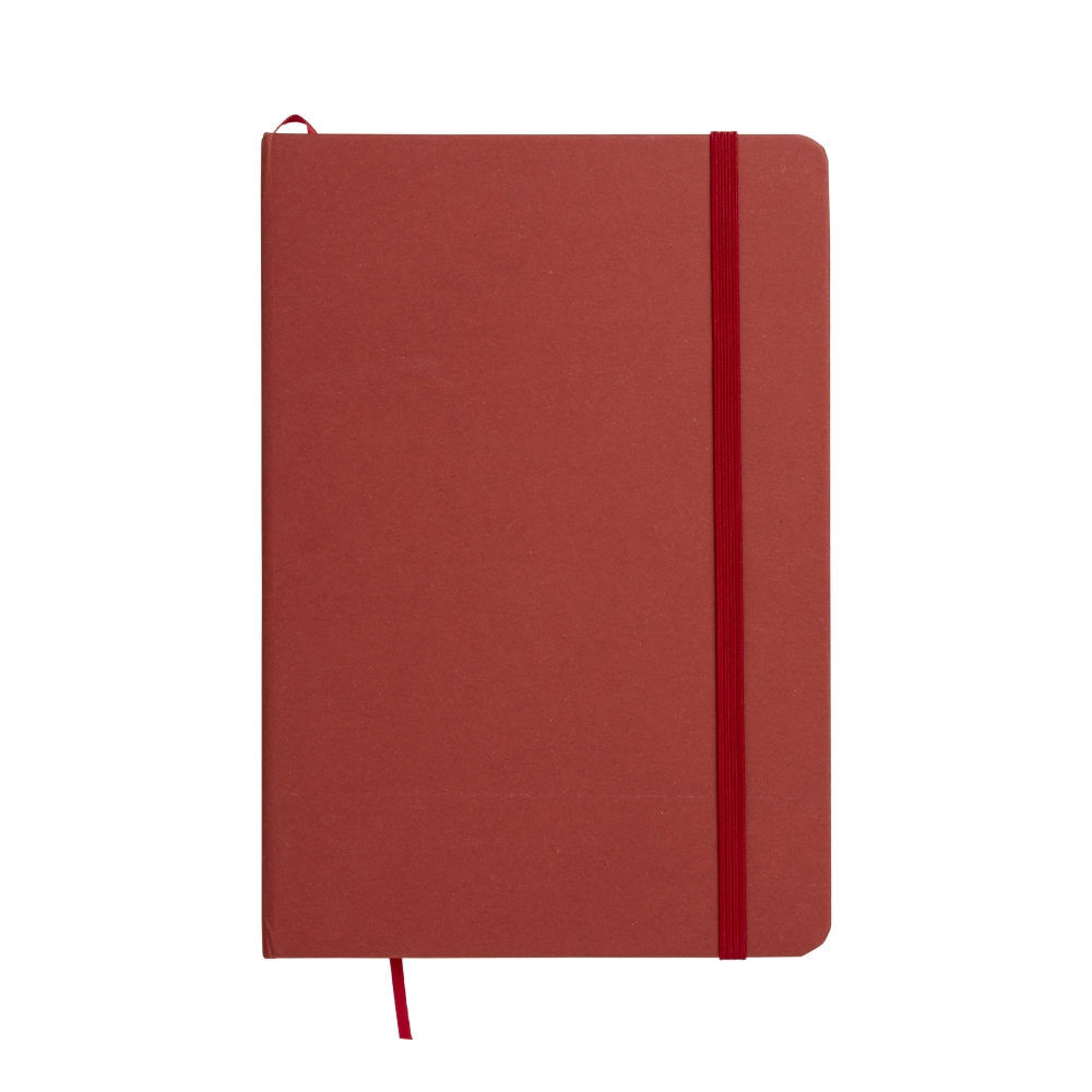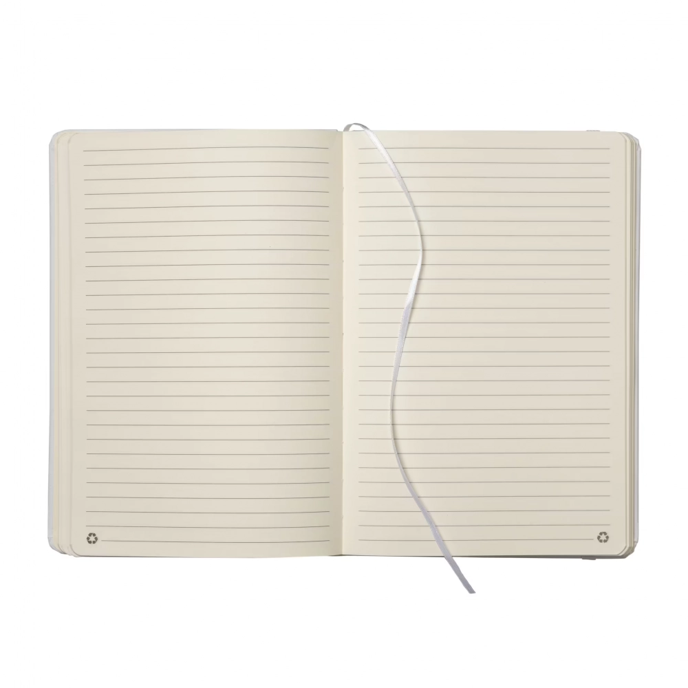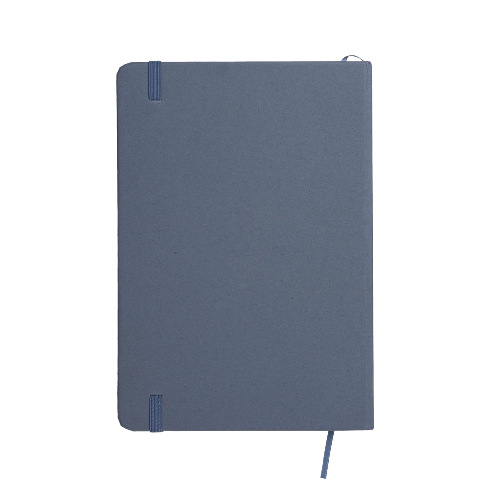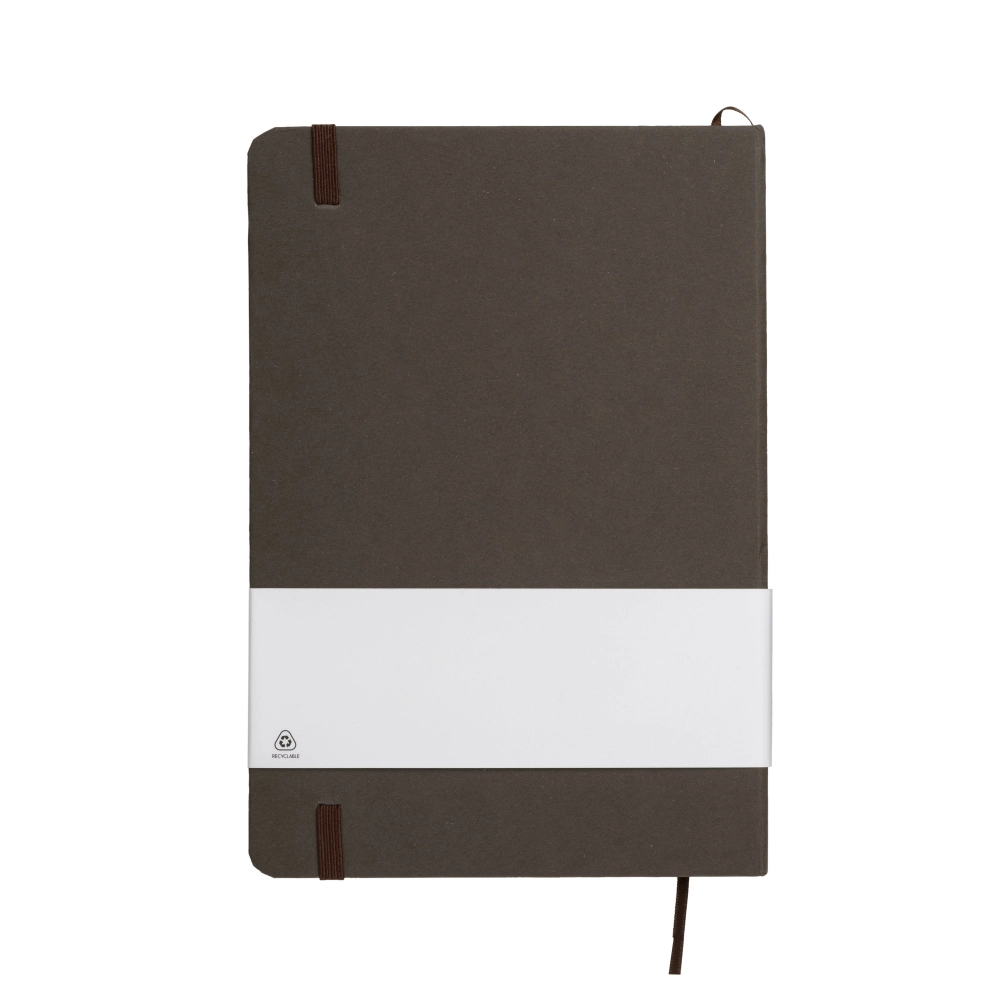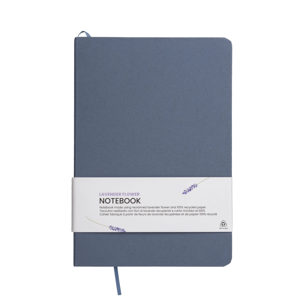 Блокнот с обложкой из остатков кофейных зерен, вишни, лаванды, лимона, кукурузы и киви. Листы в полоску из переработанной бумаги цвета слоновой кости (80 страниц), застежка на резинке и атласная закладка в тон.