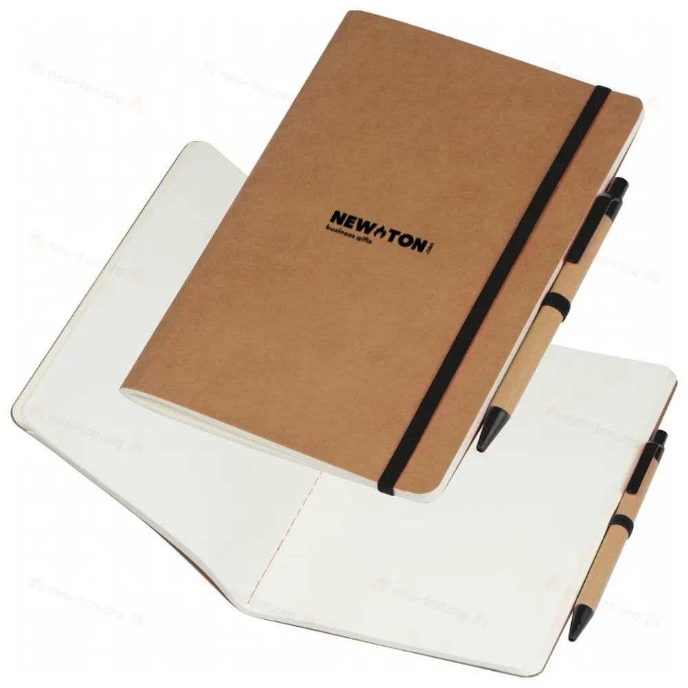 Блокнот формата A5 из переработанной бумаги с 120 страницами, эластичной лентой для закрытия и петлей для ручки, включая шариковую ручку с синим стержнем.