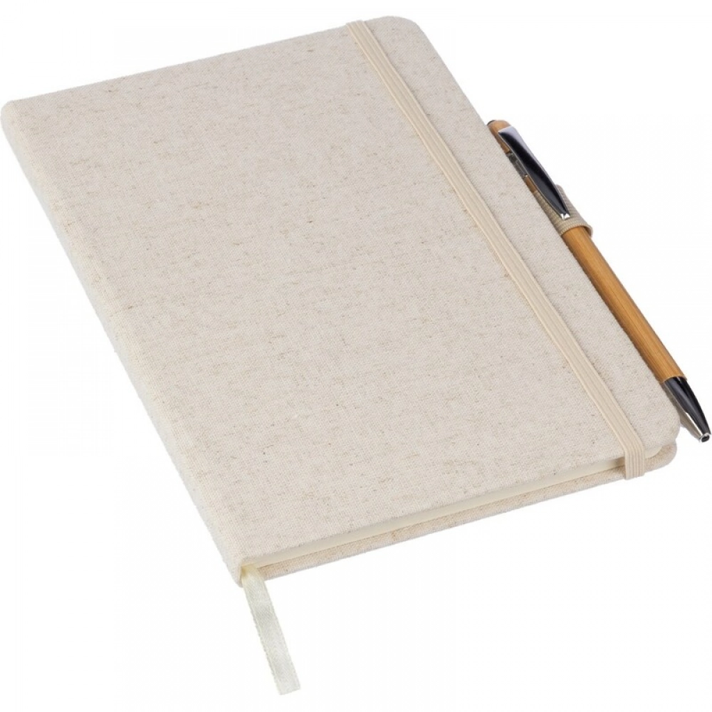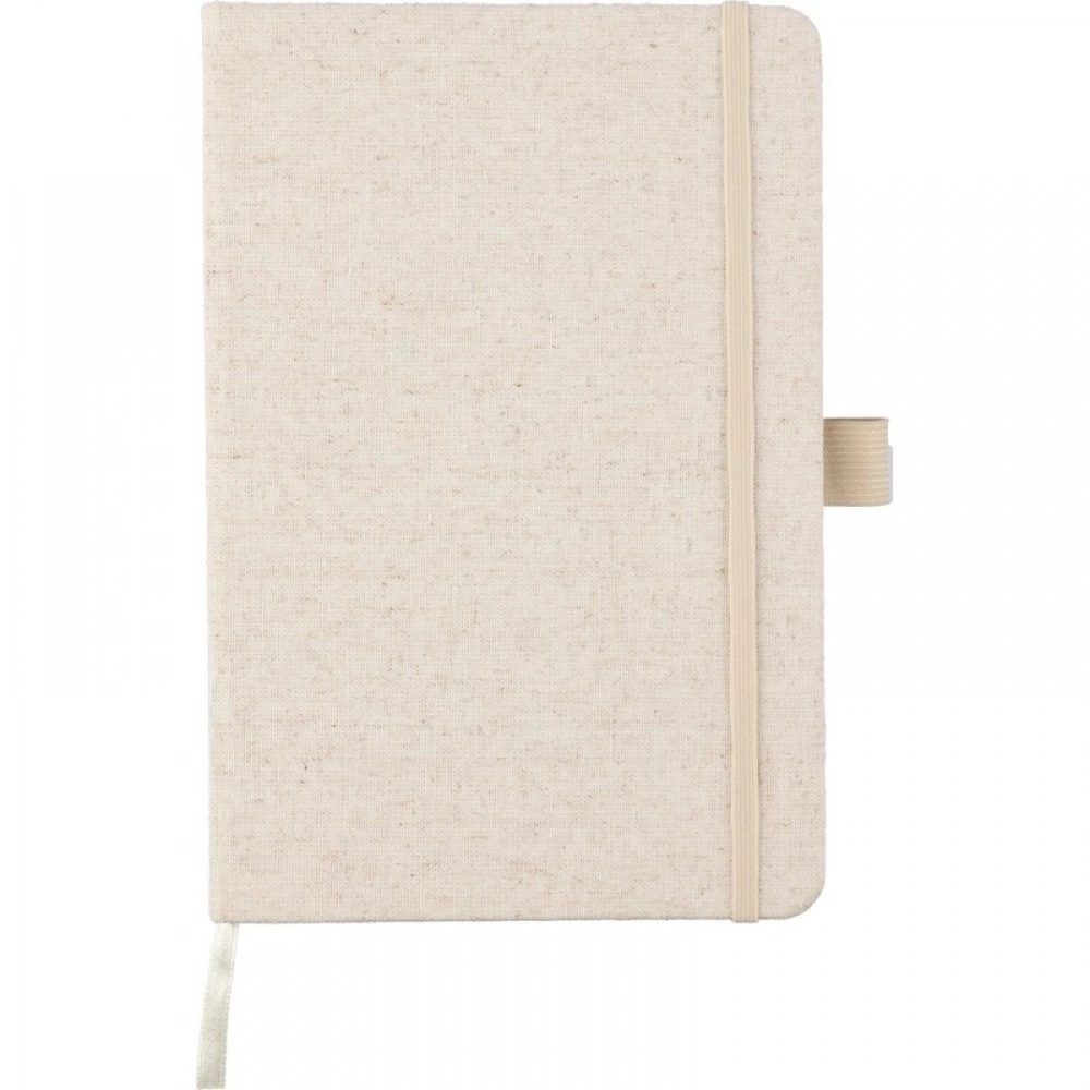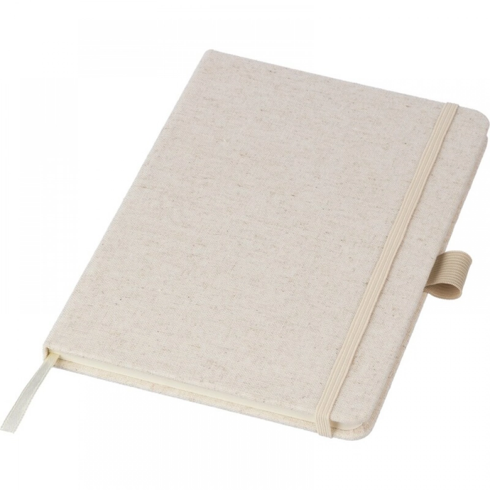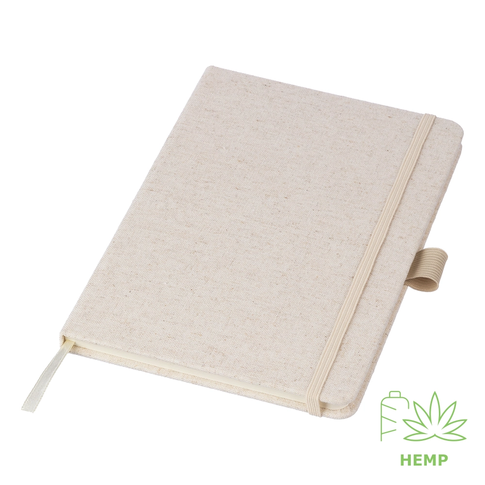 Блокнот примерно формата А5 с 80 линейными страницами, лямкой-закладкой для удобного отмечания последней страницы или важных заметок, дополнительной резинкой для закрытия в подходящем цвете, имеет петлю для ручки, помещается в школьный рюкзак, включает иконку конопли на изделии, изготовлен из конопли.