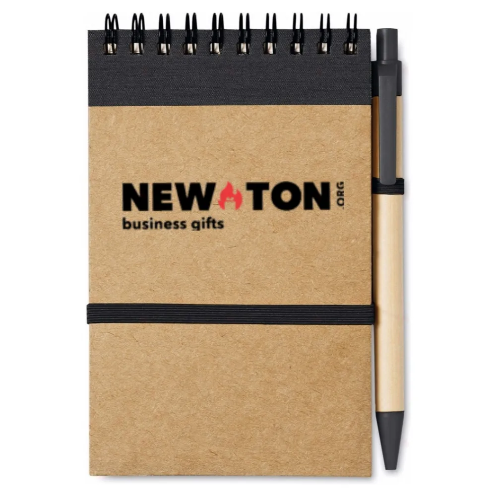 Блокнот из переработанной бумаги с ручкой в цвет. 140 страниц нелинованной переработанной бумаги (70 листов). Нажимная шариковая ручка из переработанного картона и биоразлагаемого пластика. Синие чернила. Эластичный ремешок и держатель для ручки. FSC®-certified | FSC MIX, P7.1, FSC-C213206
