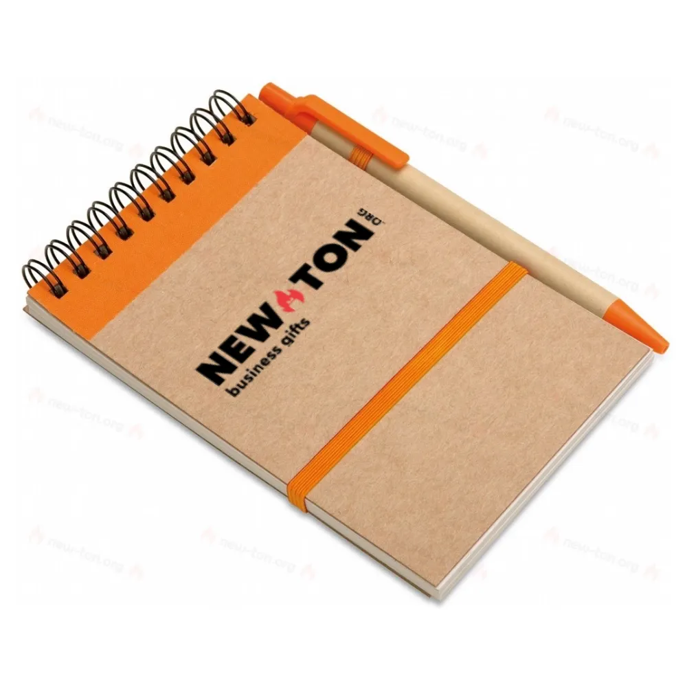 Блокнот из переработанной бумаги с ручкой в цвет. 140 страниц нелинованной переработанной бумаги (70 листов). Нажимная шариковая ручка из переработанного картона и биоразлагаемого пластика. Синие чернила. Эластичный ремешок и держатель для ручки. FSC®-certified | FSC MIX, P7.1, FSC-C213206