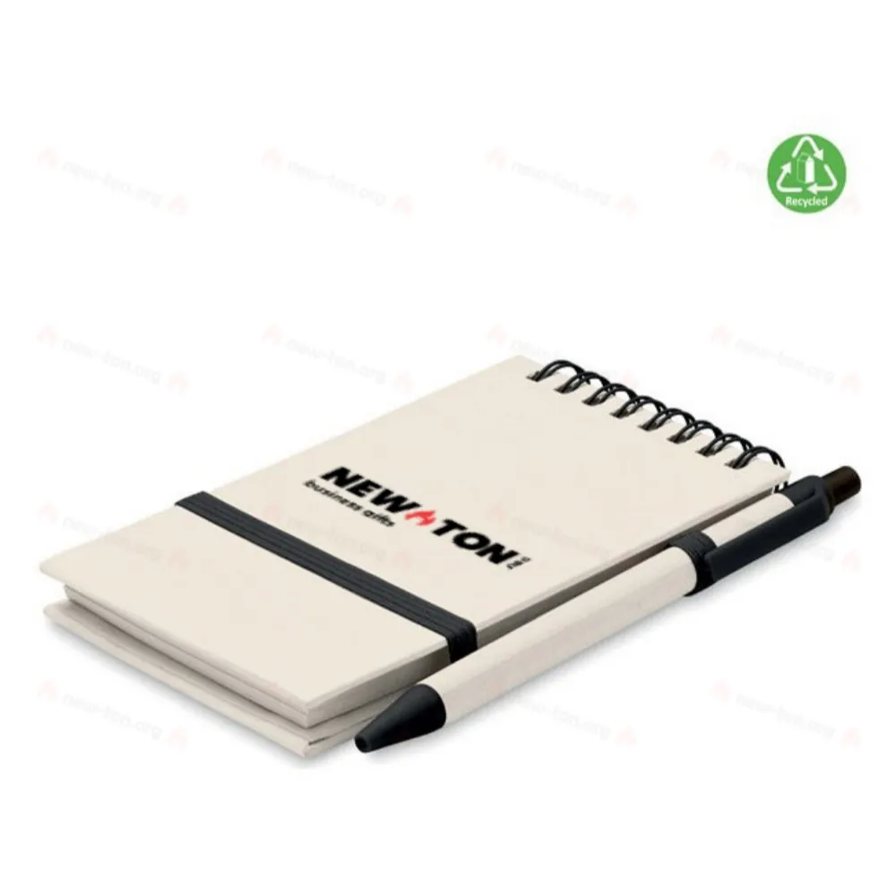 Блокнот A6 из переработанного картона на резинке. 70 листов (70% переработанного картона и 30% переработанной бумаги) в комплекте с ручкой. Синие чернила. Кольцевое скрепление. Держатель для ручки.