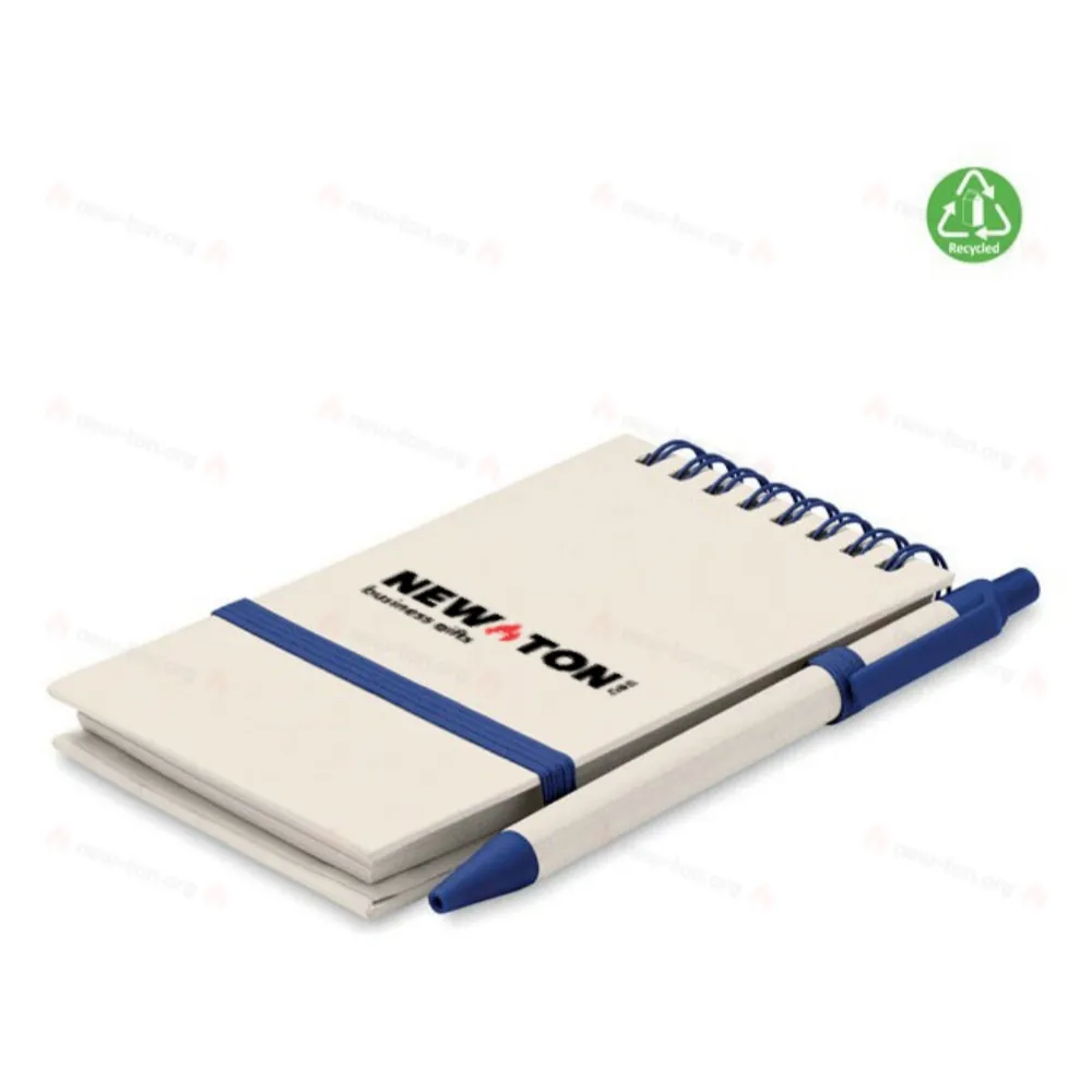 Блокнот A6 из переработанного картона на резинке. 70 листов (70% переработанного картона и 30% переработанной бумаги) в комплекте с ручкой. Синие чернила. Кольцевое скрепление. Держатель для ручки.