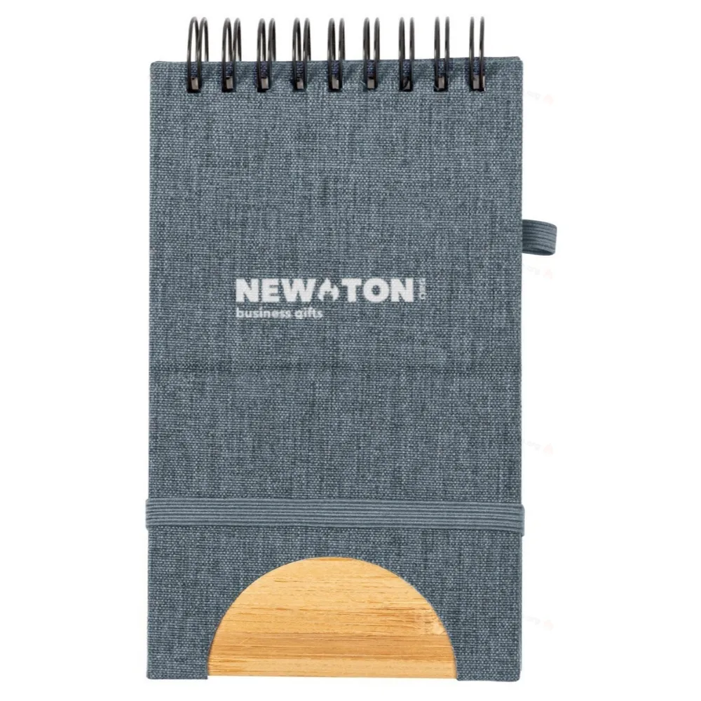 Спиральный блокнот с обложкой из RPET-полиэстера с вставкой из бамбука и функцией держателя для мобильного телефона. Содержит 80 пустых листов, резиновый ремешок и держатель для ручки.