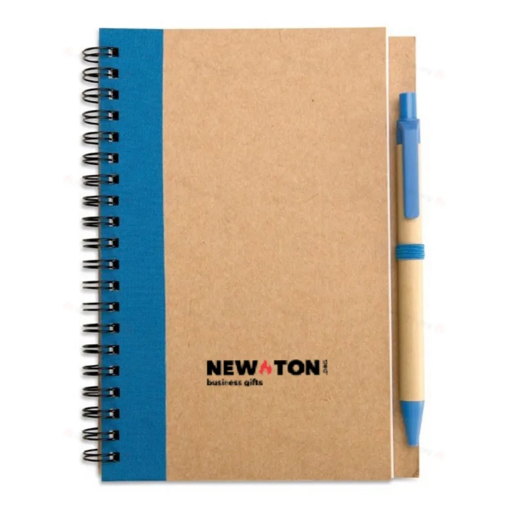 Блокнот из переработанной бумаги с ручкой в цвет. 140 страниц нелинованной переработанной бумаги (70 листов). Нажимная шариковая ручка из переработанного картона и биоразлагаемого пластика. Синие чернила. Эластичный держатель для ручки в цвет. FSC MIX CREDIT | P7.1 | FSC-C213206